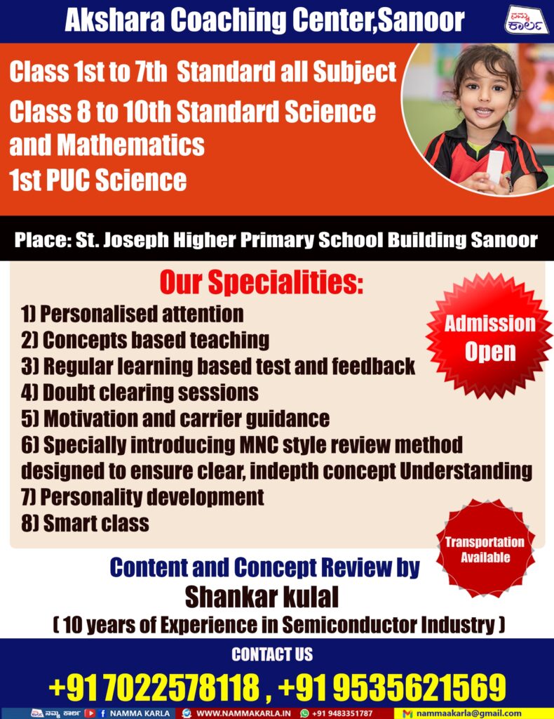 ಶಿಕ್ಷಣ ಕ್ಷೇತ್ರದಲ್ಲಿ ಮೊದಲ ಬಾರಿಗೆ MNC ಕಂಪನಿಯಲ್ಲಿ ಅಳವಡಿಕೆ ಮಾಡಿರುವ ಕಲಿಕಾ ಪದ್ಧತಿಯನ್ನು ಸಾಣೂರಿನ “ಅಕ್ಷರ ಕೋಚಿಂಗ್ ಸೆಂಟರ್” ನಲ್ಲಿ ಅಳವಡಿಸಿದ್ದು ವಿದ್ಯಾರ್ಥಿಗಳಲ್ಲಿ ಹೆಚ್ಚಿನ ಪ್ರಗತಿಯನ್ನು ಕಳೆದ ಒಂದು ವರ್ಷದಿಂದಲೇ ಕಂಡು ಪೋಷಕರ ಪ್ರಶಂಸೆಗೆ ಪಾತ್ರವಾಗಿದೆ. ಇದೀಗ ಈ ವರ್ಷದ ದಾಖಲಾತಿಯನ್ನು ಪ್ರಾರಂಭ ಮಾಡಲಾಗಿದ್ದು ಎಲ್ಲಾ ತರಗತಿಗಳು ಜೂನ್ 5ರಂದು ಪ್ರಾರಂಭಗೊಳ್ಳುತ್ತದೆ.