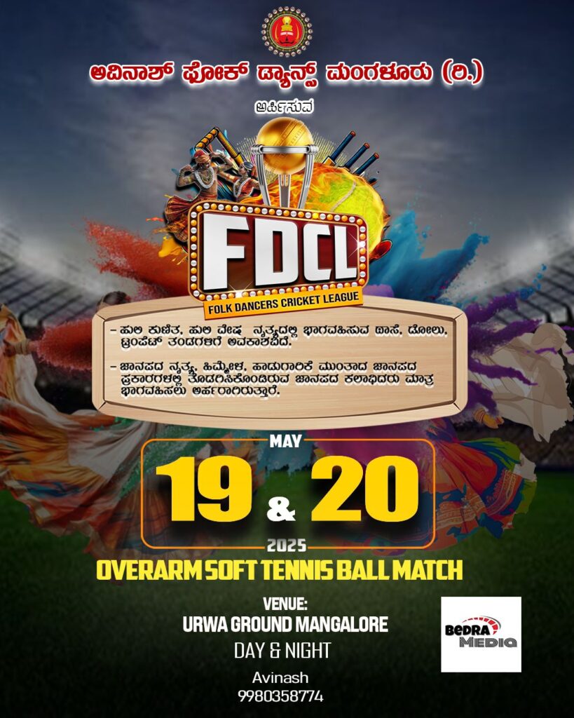 ಮಂಗಳೂರು :- ಅವಿನಾಶ್ ಪೋಕ್ ಡ್ಯಾನ್ಸ್ ಮಂಗಳೂರು (ರಿ) ಅರ್ಪಿಸುವ ಅವಿನಾಶ್ ಕುಮಾರ್ ಇವರ ಮಾರ್ಗದರ್ಶನ ದಲ್ಲಿ ಮಂಗಳೂರು ಜಾನಪದ ಇತಿಹಾಸದಲ್ಲೇ ಅತ್ಯಂತ ಅದ್ಧೂರಿಯ ಜಾನಪದ ಕಲಾವಿದರಿಗೆ ಒಂದು ವೇದಿಕೆ ಕಲ್ಪಿಸುವ ನಿಟ್ಟಿನಲ್ಲಿ ಜಾನಪದ ಕಲಾವಿದರಿಗಾಗಿ ಹುಲಿ ಕುಣಿತ ಹುಲಿವೇಶ ನೃತ್ಯದಲ್ಲಿ ಭಾಗವಹಿಸುವ ತಾಸೆ ಡೋಲು ಟ್ರಾಂಪೆಟ್ ಜಾನಪದ ನೃತ್ಯ ಹಿಮ್ಮೇಳ ಹಾಡುಗರಿಕೆ ಜಾನಪದ ಪ್ರಕಾರಗಳಲ್ಲಿ ತೊಡಗಿಸಿ ಕೊಂಡವರಿಗೆ ಮಾತ್ರ 2 ದಿನಗಳ ಮೇ 19 ಹಾಗೂ 20 ರಂದು ಮಂಗಳೂರಿನ ಕ್ರಿಕೆಟ್ ಕಾಶಿ ಉರ್ವಾ ಮೈದಾನ ದಲ್ಲಿ ಒಟ್ಟು 8 ಆಹ್ವಾನಿತ ತಂಡಗಳ ಲೀಗ್ ಮಾದರಿಯ ಟೆನ್ನಿಸ್ ಬಾಲ್, ಓವರ್ ಆರ್ಮ್ ಕ್ರಿಕೆಟ್ ಟೂರ್ನಮೆಂಟ್ FDCL-2025 +ಎಲ್ಲಾ ತಂಡಗಳಿಗೂ 15 ಸಮವಸ್ತ್ರ ವನ್ನು ಆಯೋಜಕರೇ ನೀಡಲಿದ್ದಾರೆ.
