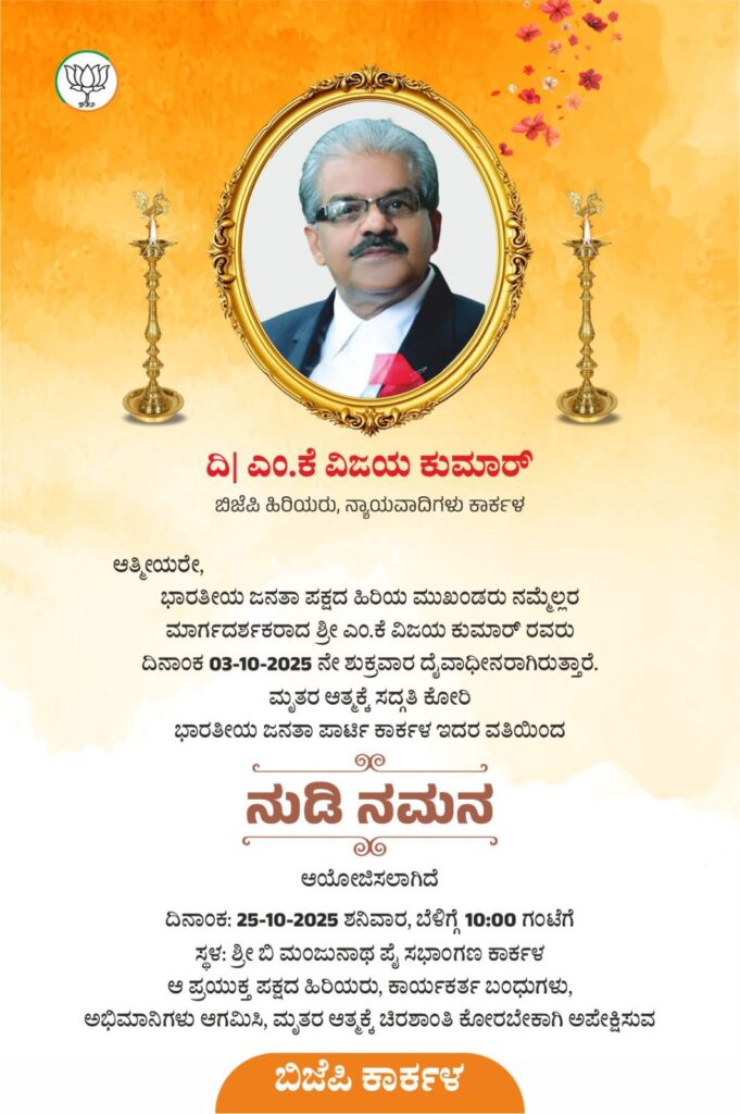ಅಕ್ಟೋಬರ್ 3 ಶುಕ್ರವಾರದಂದು ಅಗಲಿದ, ಕಾರ್ಕಳ ಬಿಜೆಪಿಯ ಹಿರಿಯ ಮುಖಂಡರು, ಖ್ಯಾತ ನ್ಯಾಯವಾದಿಗಳಾದ ಎಂ ಕೆ ವಿಜಯ್ ಕುಮಾರ್ ರವರು ಕಾರ್ಕಳ ಬಿಜೆಪಿಗೆ, ಸಮಾಜಕ್ಕೆ ನೀಡಿದ ಕೊಡುಗೆ ಅಪಾರ.