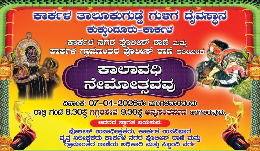 ಇಂದು ಏಪ್ರಿಲ್ 07 ಮಂಗಳವಾರದಂದು ಕಾರ್ಕಳ ನಗರ ಪೊಲೀಸ್ ಠಾಣೆ ಮತ್ತು ಕಾರ್ಕಳ ಗ್ರಾಮಾಂತರ ಪೋಲಿಸ್ ಠಾಣೆ ವತಿಯಿಂದ ಕಾರ್ಕಳದ ತಾಲೂಕು ಗುಡ್ಡೆ ಗುಳಿಗ ದೈವಸ್ಥಾನದಲ್ಲಿ ಕಾಲಾವಧಿ ನೇಮೋತ್ಸವ ನಡೆಯಲಿದೆ.