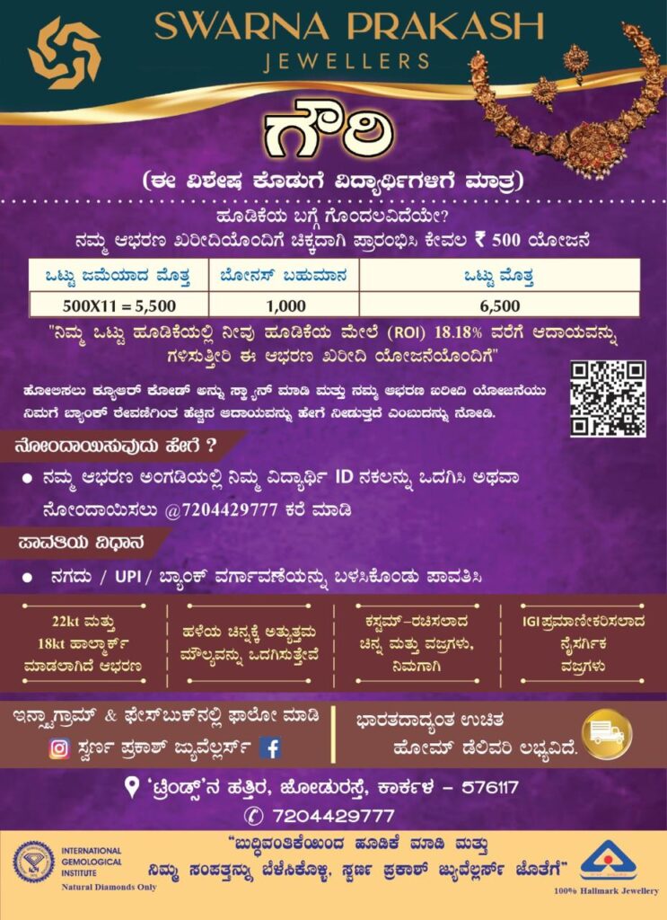 ಚಿನ್ನದ ಬೆಲೆ ಹೆಚ್ಚುತ್ತಿರುವ ಈ ಕಾಲಘಟ್ಟದಲ್ಲಿ, ಚಿನ್ನದ ಖರೀದಿ ಹಲವರಿಗೆ ಕಷ್ಟಕರವಾಗಿದೆ. ಈ ಸಮಸ್ಯೆಗೆ ಪರಿಹಾರವಾಗಿ, ಸ್ವರ್ಣ ಪ್ರಕಾಶ್ ಜುವೆಲ್ಲರ್ಸ್ ನಿಮಗೆ ವಿಶೇಷ ಚಿನ್ನದ ಖರೀದಿ ಯೋಜನೆಯನ್ನು ಪರಿಚಯಿಸುತ್ತಿದೆ.