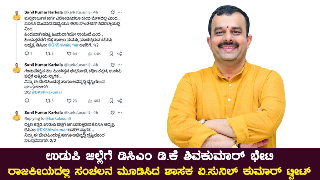 ಈ ವಿಚಾರವಾಗಿ ಕಾರ್ಕಳ ಶಾಸಕ ವಿ. ಸುನಿಲ್ ಕುಮಾರ್ ಡಿಸಿಎಂ ಡಿ.ಕೆ ಶಿವಕುಮಾರ್ ರವರಿಗೆ ವಿಭಿನ್ನವಾಗಿ ಸ್ವಾಗತ ಕೋರಿದ ಸಂದೇಶವೊಂದು ರಾಜಕೀಯ ವಲಯದಲ್ಲಿ ಭಾರಿ ಸುದ್ದಿ ಮಾಡಿದೆ.