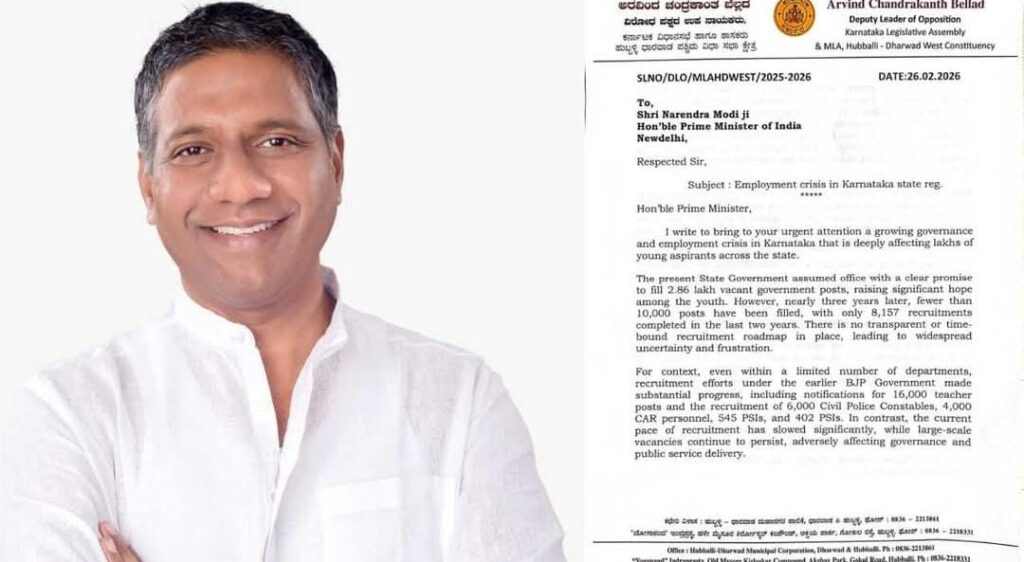 ಧಾರವಾಡ: ರಾಜ್ಯದಲ್ಲಿ ಉದ್ಯೋಗಾವಕಾಶಗಳ ಕೊರತೆ ಹಾಗೂ ಆಡಳಿತದ ನಿಧಾನಗತಿಯ ವಿರುದ್ಧ ಯುವಕರ ಅಸಮಾಧಾನ ಹೆಚ್ಚುತ್ತಿದ್ದು ಧಾರವಾಡದಲ್ಲಿ ಸಾವಿರಾರು ಉದ್ಯೋಗಾಕಾಂಕ್ಷಿಗಳು ನೇಮಕಾತಿ ಪ್ರಕ್ರಿಯೆ ವೇಗಗೊಳಿಸುವಂತೆ ಆಗ್ರಹಿಸಿ ಭಾರೀ ಪ್ರತಿಭಟನೆ ನಡೆಸಿದರು. ಈ ಹಿನ್ನೆಲೆ ಹುಬ್ಬಳ್ಳಿ–ಧಾರವಾಡ ಪಶ್ಚಿಮ ಕ್ಷೇತ್ರದ ಶಾಸಕ ಹಾಗೂ ವಿರೋಧ ಪಕ್ಷದ ಉಪನಾಯಕ ಅರವಿಂದ ಬೆಲ್ಲದ್ ಅವರು ಪ್ರಧಾನಮಂತ್ರಿ ನರೇಂದ್ರ ಮೋದಿ ಹಾಗೂ ರಾಜ್ಯಪಾಲರಿಗೆ ಪತ್ರ ಬರೆದು ಸಮಸ್ಯೆಗಳತ್ತ ಗಮನ ಸೆಳೆದಿದ್ದಾರೆ.