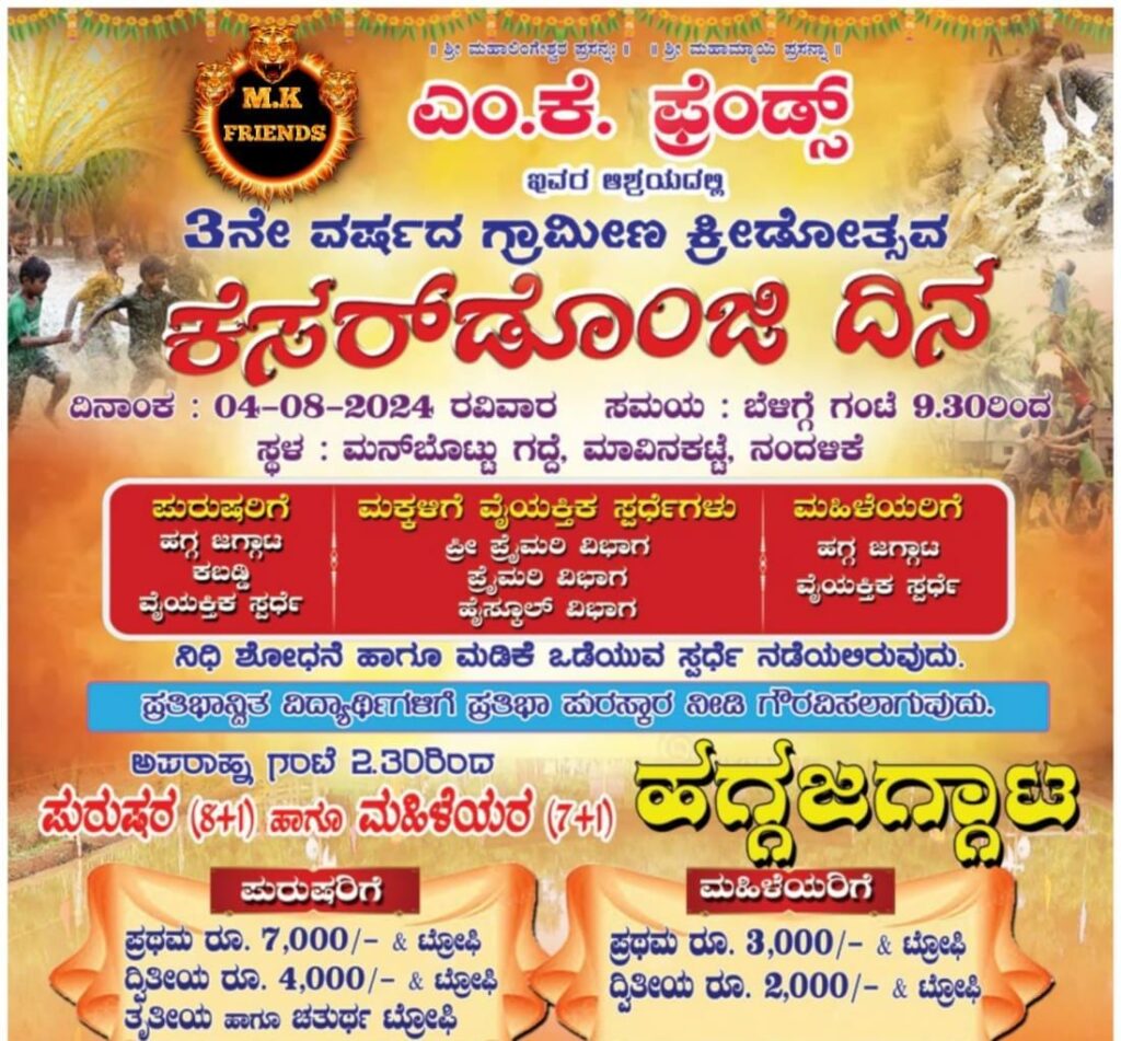 ಎಂ. ಕೆ ಫ್ರೆಂಡ್ಸ್ ಇವರ ಆಶ್ರಯದಲ್ಲಿ 3ನೇ ವರ್ಷದ ಗ್ರಾಮೀಣ ಕ್ರೀಡೋತ್ಸವ ಕೆಸರ್ ಡೊಂಜಿ ದಿನ ಕಾರ್ಯಕ್ರಮವು ದಿನಾಂಕ 4-08-2024 ರವಿವಾರ ಸಮಯ 9.30 ರಿಂದ ಮನ್ ಬೊಟ್ಟು ಗದ್ದೆ ಮಾವಿನಕಟ್ಟೆ ನಂದಳಿಕೆಯಲ್ಲಿ ನಡೆಯಲಿದೆ. ಫ್ರೀ ಪ್ರೈಮರಿ, ಪ್ರೈಮರಿ, ಹೈ ಸ್ಕೂಲ್ ವಿಭಾಗದ ವಿದ್ಯಾರ್ಥಿಗಳಿಗೆ ವೈಯುಕ್ತಿಕ ವಿಭಾಗದಲ್ಲಿ ಸ್ಪರ್ಧೆಗಳು ನಡೆಯಲಿರುವುದು.