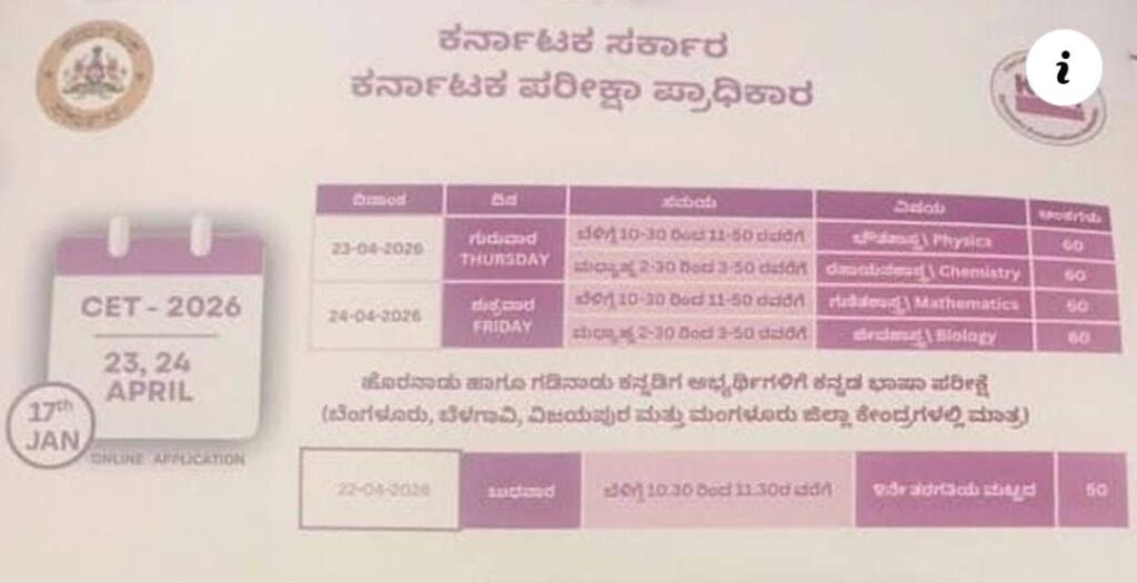 ಏಪ್ರಿಲ್ 23ರ ಬೆಳಿಗ್ಗೆ 10.30 ರಿಂದ 11:50ರವರೆಗೆ ಭೌತಶಾಸ್ತ್ರ, ಮಧ್ಯಾಹ್ನ 2:30 ರಿಂದ 3:50 ರವರೆಗೆ ರಾಸಾಯನಶಾಸ್ತ್ರ ಪರೀಕ್ಷೆಗಳು ನಡೆಯಲಿದ್ದು ಏಪ್ರಿಲ್ 24ರ ಬೆಳಗ್ಗೆ 10:30 ರಿಂದ 11:50ರವರೆಗೆ ಗಣಿತಶಾಸ್ತ್ರ, ಮಧ್ಯಾಹ್ನ 2:30 ರಿಂದ 3:50 ರವರೆಗೆ ಜೀವಶಾಸ್ತ್ರ ಪರೀಕ್ಷೆಗಳು ನಡೆಯಲಿದೆ. ಹೊರನಾಡು ಹಾಗೂ ಗಡಿನಾಡು ಕನ್ನಡಿಗ ಅಭ್ಯರ್ಥಿಗಳಿಗೆ ಕನ್ನಡ ಭಾಷಾ ಪರೀಕ್ಷೆಯು ಏಪ್ರಿಲ್ 22ರಂದು ಬೆಳಗ್ಗೆ 10:30 ರಿಂದ 11:30 ರವರೆಗೆ ಬೆಂಗಳೂರು, ಬೆಳಗಾವಿ, ವಿಜಯಪುರ ಮತ್ತು ಮಂಗಳೂರು ಜಿಲ್ಲಾ ಕೇಂದ್ರಗಳಲ್ಲಿ ನಡೆಯಲಿದೆ.