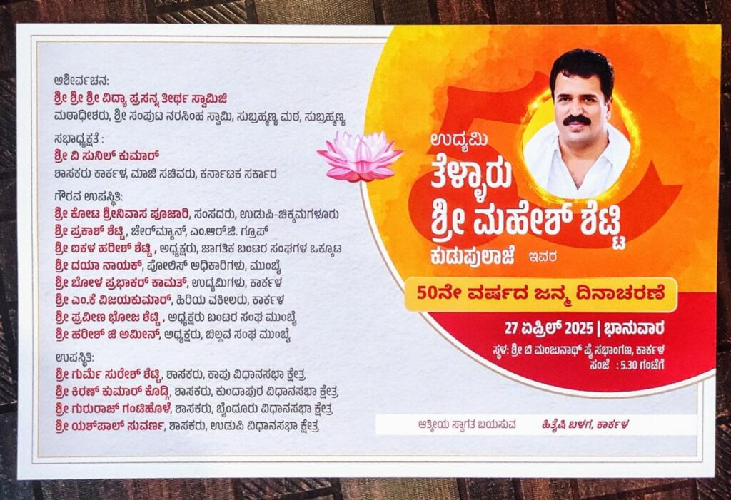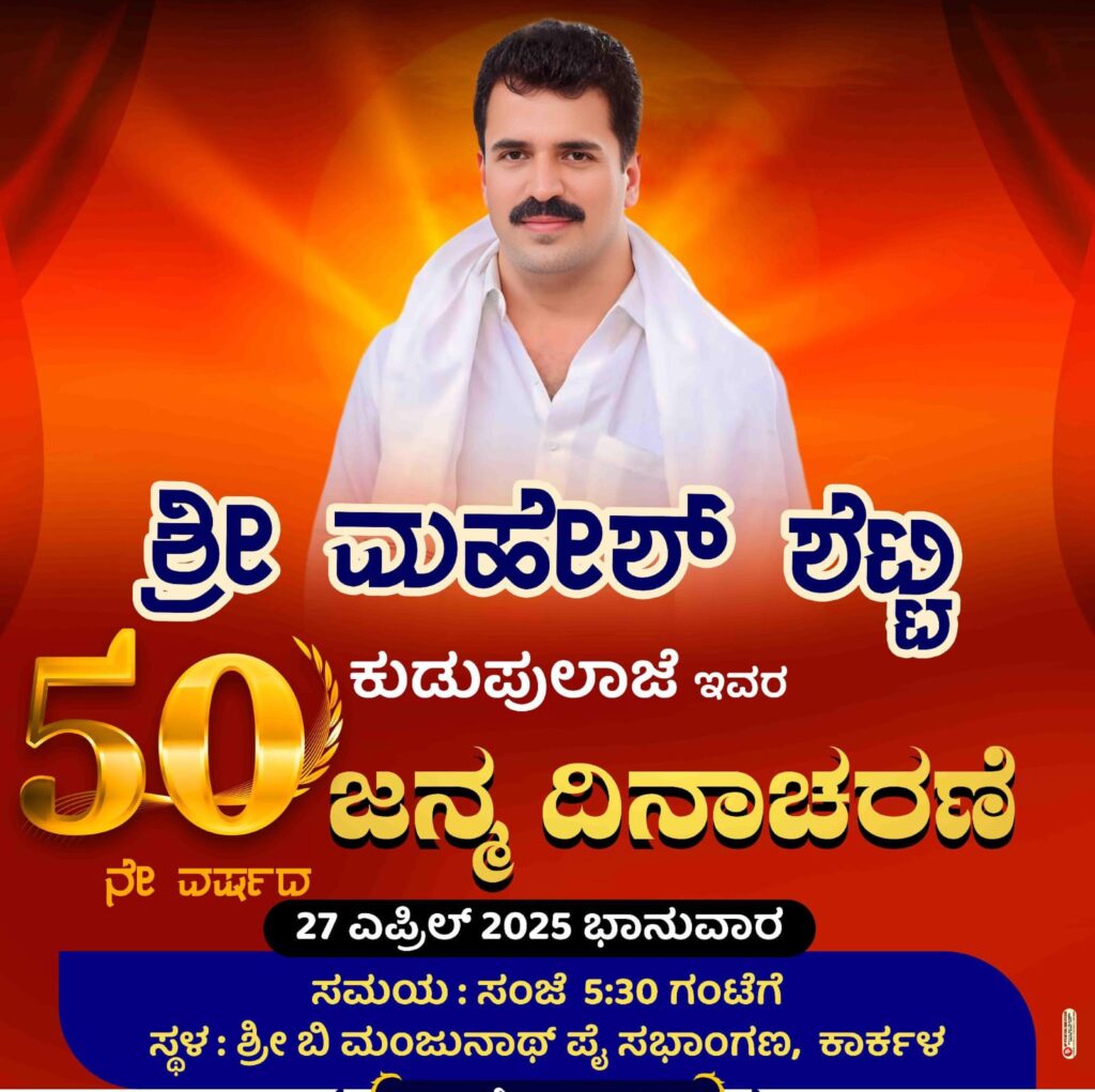 ಕಾರ್ಕಳ: ಏಪ್ರಿಲ್ 27, 2025 ಭಾನುವಾರದಂದು ಕಾರ್ಕಳದ ಮಂಜುನಾಥ ಪೈ ಸಭಾಂಗಣದಲ್ಲಿ ಸಂಜೆ 5:30 ವೇಳೆಗೆ, ಉದ್ಯಮಿ ತೆಳ್ಳಾರು ಮಹೇಶ್ ಶೆಟ್ಟಿ, ಕುಡುಪುಲಾಜೆ ಇವರ 50ನೇ ವರ್ಷದ ಜನ್ಮ ದಿನಾಚರಣೆಯ ಆಚರಣೆ ನಡೆಯಲಿದೆ.