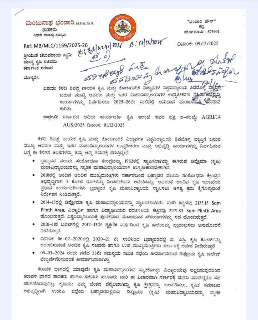 ಮಂಜುನಾಥ ಭಂಡಾರಿ ಅವರು ಕೃಷಿ ಸಚಿವರಿಗೆ ಬರೆದ ಪತ್ರದಲ್ಲಿ 2025-26ನೇ ಸಾಲಿನ ಆಯವ್ಯಯದಲ್ಲಿ ವಿಶೇಷ ಅನುದಾನವನ್ನು ಮೀಸಲಿಡುವಂತೆ ಮತ್ತು ಕೂಡಲೇ ಈ ಕಾಲೇಜನ್ನು ಮೇಲ್ದರ್ಜೆಗೇರಿಸುವಂತೆ ಒತ್ತಾಯಿಸಿದ್ದರು. ಇದಕ್ಕೆ ಸಕಾರಾತ್ಮಕವಾಗಿ ಸ್ಪಂದಿಸಿರುವ ಕೃಷಿ ಸಚಿವರು, ಲಭ್ಯವಿರುವ ಸೌಕರ್ಯಗಳನ್ನು ಬಳಸಿಕೊಂಡು ಶೀಘ್ರವೇ ಬಿ.ಎಸ್ಸಿ (ಕೃಷಿ) ಪದವಿ ಶಿಕ್ಷಣ ಆರಂಭಿಸಲು ಅಗತ್ಯ ಕ್ರಮ ಕೈಗೊಳ್ಳಲಾಗುವುದು ಎಂದು ಭರವಸೆ ನೀಡಿದ್ದಾರೆ.