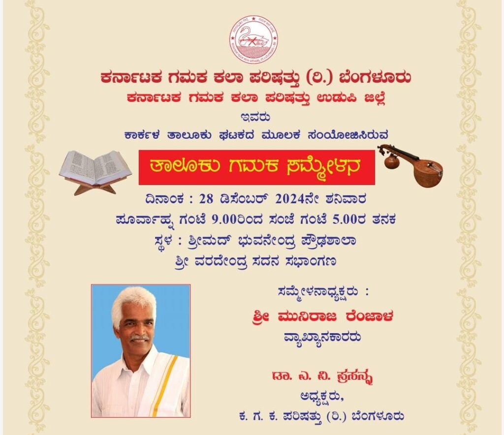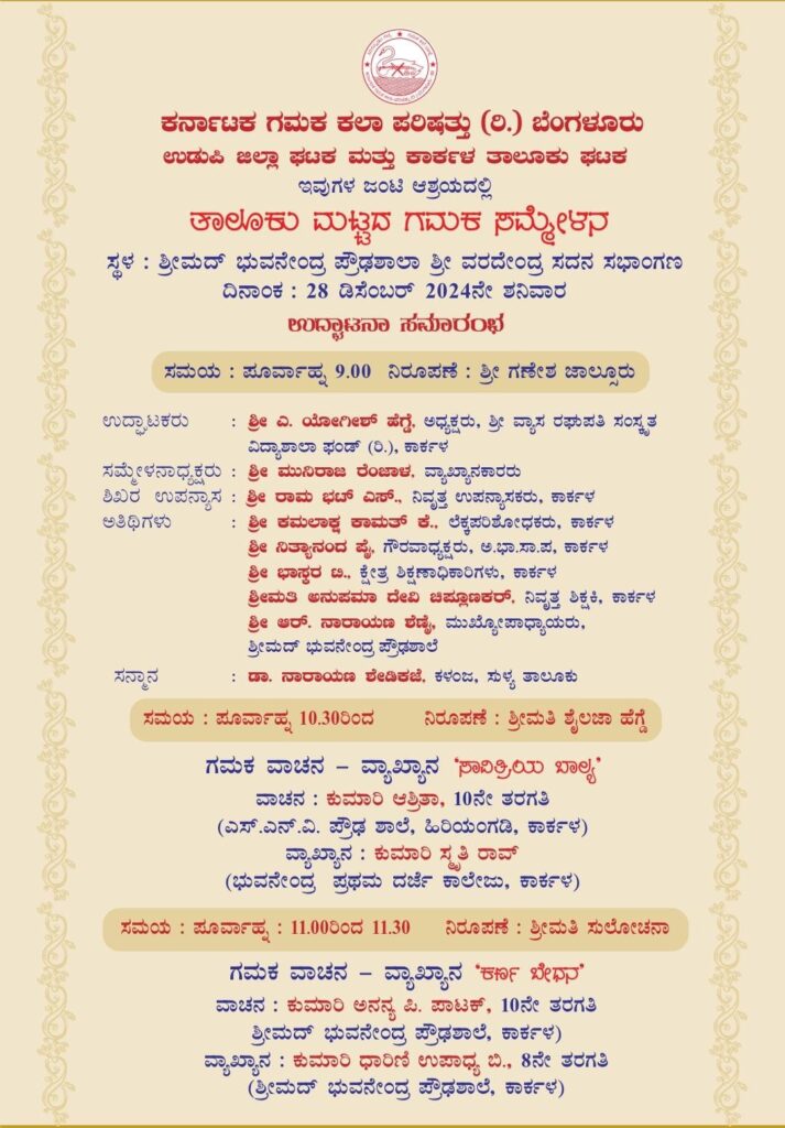 ಕಾರ್ಕಳ: ಡಿ.28 2024ನೇ ಶನಿವಾರದಂದು ಶ್ರೀಮದ್ ಭುವನೇಂದ್ರ ಪ್ರೌಢಶಾಲಾ ಶ್ರೀ ವರದೇಂದ್ರ ಸದನ ಸಭಾಂಗಣದಲ್ಲಿ ತಾಲೂಕು ಗಮಕ ಸಮ್ಮೇಳನ ನಡೆಯಲಿದೆ.