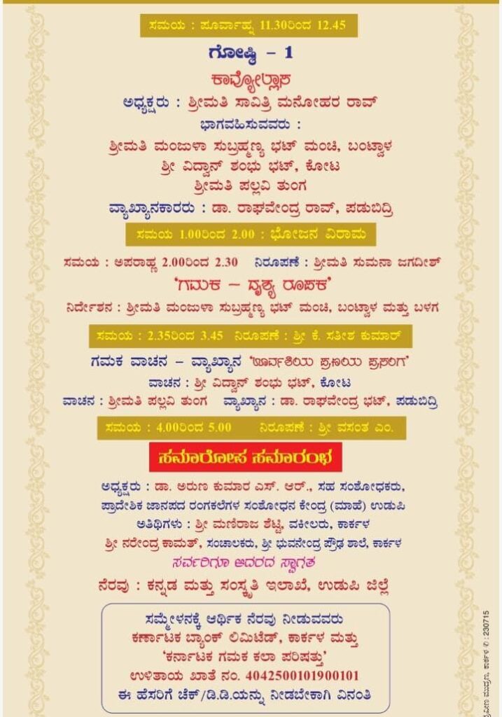 ಬೆಳಗ್ಗೆ 10:30 ರಿಂದ ಗಮಕ ವಾಚನ-ವ್ಯಾಖ್ಯಾನ “ಸಾವಿತ್ರಿಯ ಬಾಲ್ಯ”, 11:00 ರಿಂದ ಗಮಕವಾಚನ- ವ್ಯಾಖ್ಯಾನ “ಕರ್ಣಭೇದ”, 11:30 ರಿಂದ “ಕಾವ್ಯೋಲ್ಲಾಸ” ಮಧ್ಯಾಹ್ನ 2 ಗಂಟೆಯಿಂದ “ಗಮಕ -ದೃಶ್ಯ ರೂಪಕ”, 2:35 ರಿಂದ “ಊರ್ವಶಿಯ ಪ್ರಣಯ ಪ್ರಸಂಗ” ಕಾರ್ಯಕ್ರಮಗಳು ನಡೆಯಲಿದೆ.