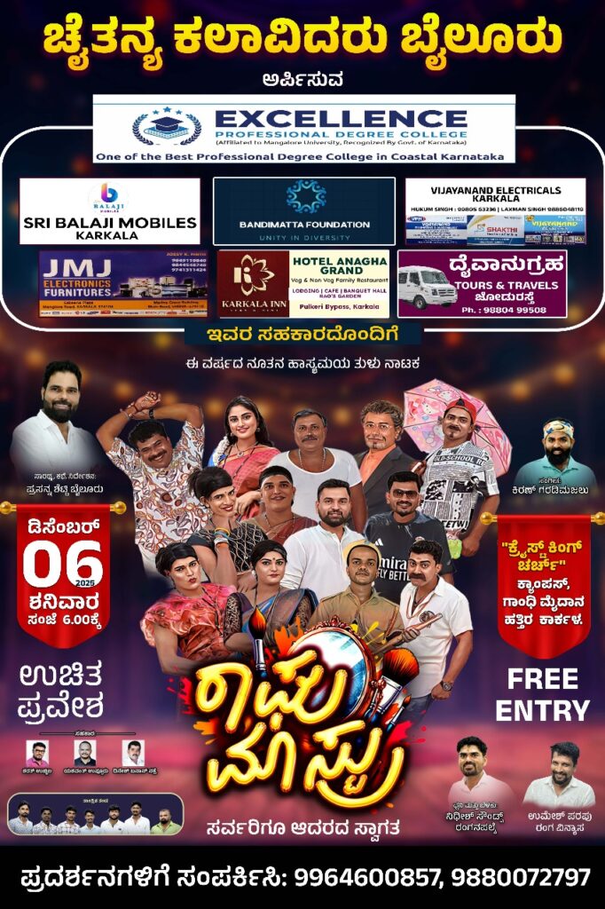 ಕಾರ್ಕಳ:ಡಿಸೆಂಬರ್ 06 ರಂದು ಚೈತನ್ಯ ಕಲಾವಿದರು ಬೈಲೂರು ಅವರಿಂದ ಕ್ರೈಸ್ಟ್ ಕಿಂಗ್ ಚರ್ಚ್ ಕ್ಯಾಂಪಸ್ ಗಾಂಧಿ ಮೈದಾನದಲ್ಲಿ ಸಂಜೆ 06:00 ಗಂಟೆಗೆ ‘ರಾಘು ಮಾಸ್ಟ್ರು’ ಎಂಬ ತುಳು ಹಾಸ್ಯಮಯ ನಾಟಕ ನಡೆಯಲಿದೆ.