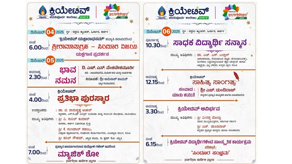 ಈ ಮೂರು ದಿನಗಳ ಸಂಭ್ರಮವು ಕ್ರಿಯೇಟಿವ್ ಶಿಕ್ಷಣ ಸಂಸ್ಥೆಯ ಕ್ಯಾಂಪಸ್ನಲ್ಲಿ ವಿವಿಧ ಸಾಂಸ್ಕೃತಿಕ, ವಿದ್ಯಾಭ್ಯಾಸಿಕ ಮತ್ತು ಮನರಂಜನಾ ಕಾರ್ಯಕ್ರಮಗಳ ಮೂಲಕ ವಿದ್ಯಾರ್ಥಿಗಳ ಪ್ರತಿಭಾ ಪ್ರದರ್ಶನಕ್ಕೆ ವೇದಿಕೆಯಾಗಲಿದೆ. ಡಿಸೆಂಬರ್ 4, 2025 – ಸಂಜೆ 6.00 ಗಂಟೆಗೆ ಕಾರ್ಯಕ್ರಮಕ್ಕೆ ಭವ್ಯ ಚಾಲನೆ ನೀಡಲಿದ್ದು, ಸಾಂಸ್ಕೃತಿಕ ಸಂಭ್ರಮದ ಉದ್ಘಾಟನೆ ನಡೆಯಲಿದೆ. ಕರಾವಳಿಯ ಸಾಂಪ್ರದಾಯಿಕ