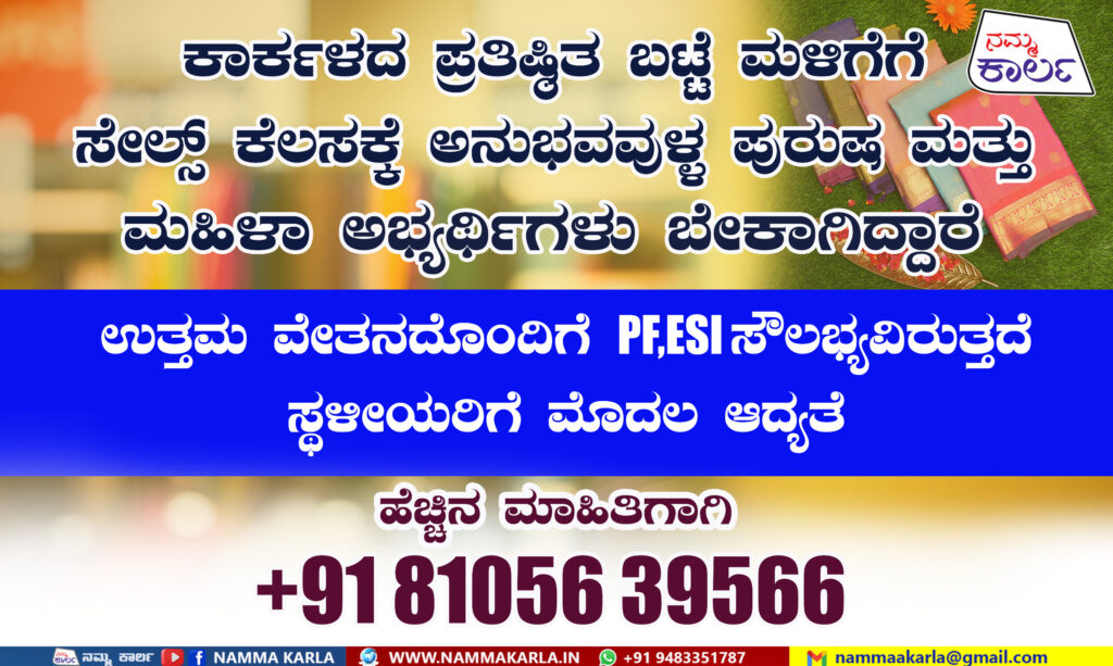 ಕಾರ್ಕಳದಲ್ಲಿ ಕಾರ್ಯನಿರ್ವಹಿಸುತ್ತಿರುವ ಪ್ರತಿಷ್ಠಿತ ಬಟ್ಟೆ ಮಳಿಗೆಗೆ ಸೇಲ್ಸ್ ಅನುಭವವುಳ್ಳ ಪುರುಷ ಮತ್ತು ಮಹಿಳಾ ಅಭ್ಯರ್ಥಿಗಳು ಬೇಕಾಗಿದ್ದಾರೆ.ಉತ್ತಮ ವೇತನದೊಂದಿಗೆ PF,ESI ಸೌಲಭ್ಯವಿರುತ್ತದೆ,ಸ್ಥಳೀಯರಿಗೆ ಮೊದಲ ಆದ್ಯತೆ