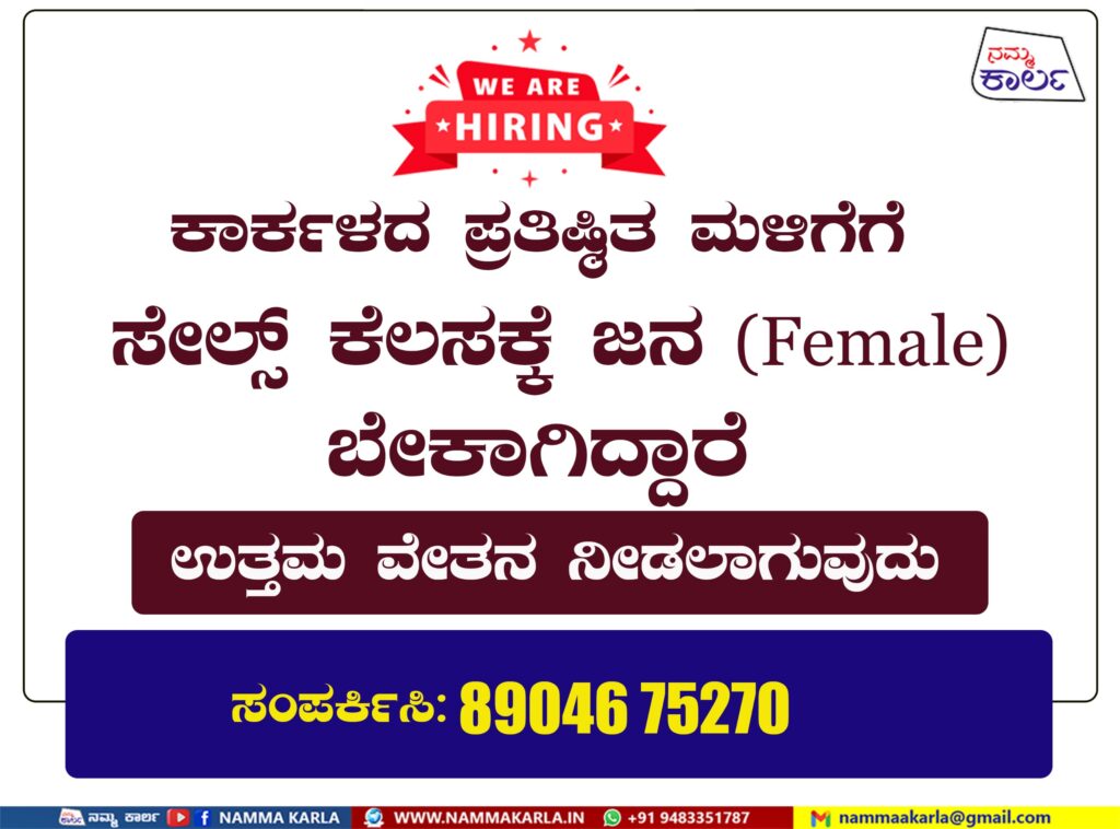 ಕಾರ್ಕಳದ ಪ್ರತಿಷ್ಠಿತ ಮಳಿಗೆಗಳಿಗೆ ಸೇಲ್ಸ್ ಕೆಲಸಕ್ಕೆ ಮಹಿಳಾ ಕೆಲಸಗಾರರು ಬೇಕಾಗಿದ್ದು ಆಸಕ್ತಿ ಇರುವವರು 8904675270 ಸಂಪರ್ಕಿಸಬಹುದಾಗಿದೆ.