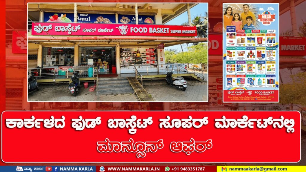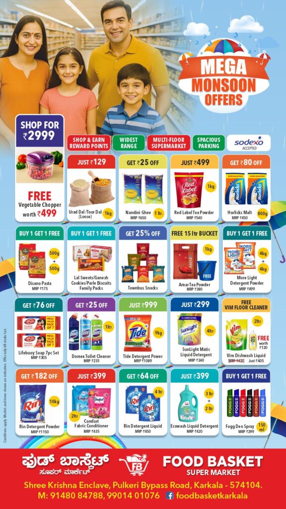 ನಿಮ್ಮ ನೆಚ್ಚಿನ ಫುಡ್ ಬಾಸ್ಕೆಟ್ ಸೂಪರ್ ಮಾರ್ಕೆಟ್ , ಪುಲ್ಕೇರಿ , ಬೈಪಾಸ್ ನಲ್ಲಿ ಮೆಗಾ ಮಾನ್ಸೂನ್ ಆಫರ್.