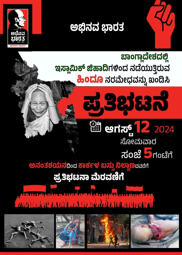 ಬಾಂಗ್ಲಾದೇಶದ ಹಿಂದೂ ದೇವಸ್ಥಾನಗಳ ಮೇಲೆ ಮತ್ತು ಬಾಂಗ್ಲಾ ಹಿಂದೂಗಳ ಮೇಲೆ ಆಗುತ್ತಿರುವ ಅತಿಕ್ರೂರ ದಾಳಿಯನ್ನು ಖಂಡಿಸಲು ಅಭಿನವ ಭಾರತ ವತಿಯಿಂದ ಕಾರ್ಕಳದ ಸಮಸ್ತ ಹಿಂದೂ ಸಮಾಜದ ಮುಂದಾಳುತ್ವದಲ್ಲಿ ಬೃಹತ್ ಪ್ರತಿಭಟನಾ ಮೆರವಣಿಗೆ.