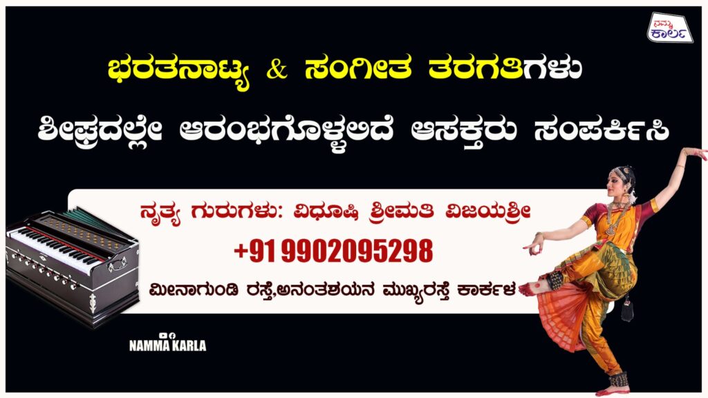 ಕಾರ್ಕಳದ ಮೀನಾಗುಂಡಿ ರಸ್ತೆ, ಅನಂತಶಯನ ಬಳಿ ಭರತನಾಟ್ಯ & ಸಂಗೀತ ತರಗತಿಗಳು ಶ್ರೀಘ್ರದಲ್ಲೇ, ಆರಂಭಗೊಳ್ಳಲಿದೆ. ಆಸಕ್ತರು ಸಂಪರ್ಕಿಸಿ