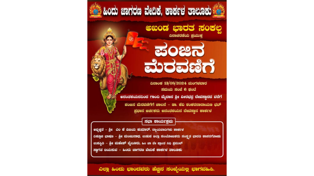 ಹಿಂದು ಜಾಗರಣ ವೇದಿಕೆ ಕಾರ್ಕಳ ತಾಲೂಕು ಇದರ ವತಿಯಿಂದ ಅಖಂಡ ಭಾರತ ಸಂಕಲ್ಪ ದಿನಾಚರಣೆಯ ಪ್ರಯುಕ್ತ ಪಂಜಿನ ಮೆರವಣಿಗೆಯು ದಿನಾಂಕ 13/07/2024 ಮಂಗಳವಾರ ನಡೆಯಲಿದೆ.ಸಾಯಂಕಾಲ ಸಂಜೆ 6 ಘಂಟೆಗೆಅನಂತಶಯನದಿಂದ ಗಾಂದಿ ಮೈದಾನ ಶ್ರೀ ವೀರಭದ್ರ ದೇವಸ್ಥಾನದ ವರೆಗೆ ನಡೆಯಲಿದೆ.ಪಂಜಿನ ಮೆರವಣಿಗೆಗೆ ಡಾ. ಕೆವಿ ಶಂಕರನಾರಾಯಣ ಭಟ್ ಪ್ರಧಾನ ಅರ್ಚಕರು ಅನಂತಶಯನ ದೇವಸ್ಥಾನ ಇವರು ಚಾಲನೆ ನೀಡಲಿದ್ದಾರೆ.