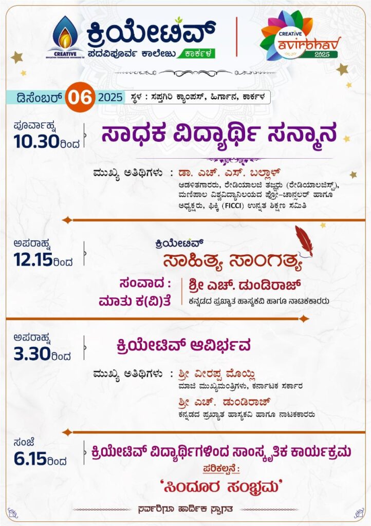 ಬೆಳಿಗ್ಗೆ 10.30 ರಿಂದ ಸಾಧಕ ವಿದ್ಯಾರ್ಥಿಗಳಿಗೆ ಸನ್ಮಾನ ಕಾರ್ಯಕ್ರಮ ನಡೆಯಲಿದ್ದು ಮಧ್ಯಾಹ್ನ 12:15 ರಿಂದ ಕನ್ನಡದ ಪ್ರಖ್ಯಾತ ಹಾಸ್ಯ ಕವಿ ಹಾಗೂ ನಾಟಕಕಾರರಾದ ಎಚ್ ಡುಂಡಿರಾಜ್ ಅವರಿಂದ ‘ಕ್ರಿಯೇಟಿವ್ ಸಾಹಿತ್ಯ-ಸಾಂಗತ್ಯ’ ಮಾತುಕತೆ ನಡೆಯಲಿದೆ. ಸಂಜೆ 6:15 ರಿಂದ ಕ್ರಿಯೇಟಿವ್ ವಿದ್ಯಾರ್ಥಿಗಳಿಂದ ‘ಸಿಂಧೂರ-ಸಂಭ್ರಮ’ ಎಂಬ ಪರಿಕಲ್ಪನೆಯೊಂದಿಗೆ ವಿವಿಧ ಸಾಂಸ್ಕೃತಿಕ ಕಾರ್ಯಕ್ರಮಗಳು ನೆರವೇರಲಿದೆ.