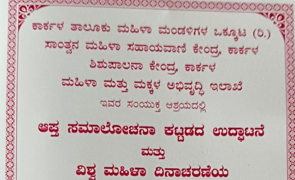 ಕಾರ್ಕಳ ತಾಲೂಕು ಮಹಿಳಾ ಮಂಡಳಿಗಳ ಒಕ್ಕೂಟ ರಿ., ಸಾಂತ್ವನ ಮಹಿಳಾ ಸಹಾಯವಾಣಿ ಕೇಂದ್ರ ,ಕಾರ್ಕಳ ಶಿಶುಪಾಲನಾ ಕೇಂದ್ರ ಕಾರ್ಕಳ, ಮಹಿಳಾ ಮತ್ತು ಮಕ್ಕಳ ಅಭಿವೃದ್ಧಿ ಇಲಾಖೆ ಸಂಯುಕ್ತ ಆಶ್ರಯದಲ್ಲಿ,”ಆಪ್ತ ಸಮಾಲೋಚನಾ ಕಟ್ಟಡ ಉದ್ಘಾಟನೆ ಮತ್ತು ವಿಶ್ವ ಮಹಿಳಾ ದಿನಾಚರಣೆ” ಏಪ್ರಿಲ್ 4ರಂದು ಶನಿವಾರ, ಪೂರ್ವಾಹ್ನ 10 ಗಂಟೆಗೆ ಕಾರ್ಕಳ ತಾಲೂಕು ಮಹಿಳಾ ಒಕ್ಕೂಟ ಸಭಾಂಗಣ ಮೆಸ್ಕಾಂ ರೋಡ್ ಬಂಡಿಮಠ ಕಾರ್ಕಳ ಇಲ್ಲಿ ನಡೆಯಲಿದೆ.