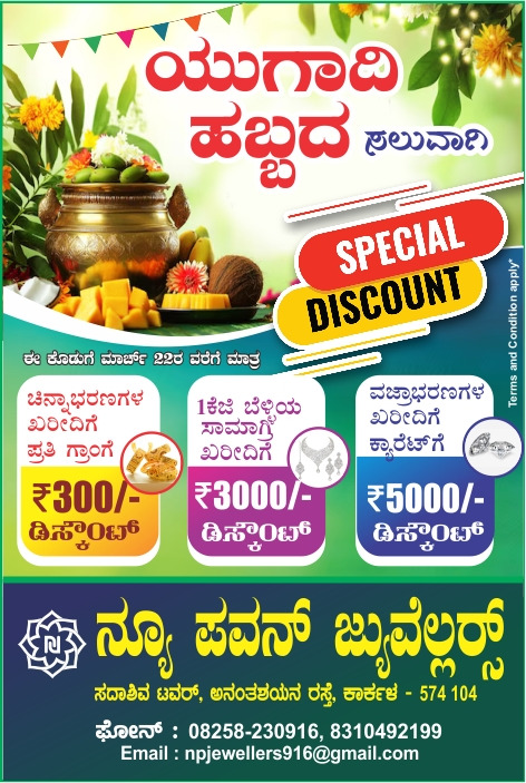 ಕಾರ್ಕಳ: ಯುಗಾದಿ ಹಬ್ಬದ ಪ್ರಯುಕ್ತ ನಗರದ ಪ್ರಖ್ಯಾತ ಚಿನ್ನಾಭರಣ ಮಳಿಗೆ ನ್ಯೂ ಪವನ್ ಜ್ಯುವೆಲ್ಲರ್ಸ್ ನಲ್ಲಿ, ಖರೀದಿಯ ಮೇಲೆ ಗ್ರಾಹಕರಿಗಾಗಿ ವಿಶೇಷ ರಿಯಾಯಿತಿ