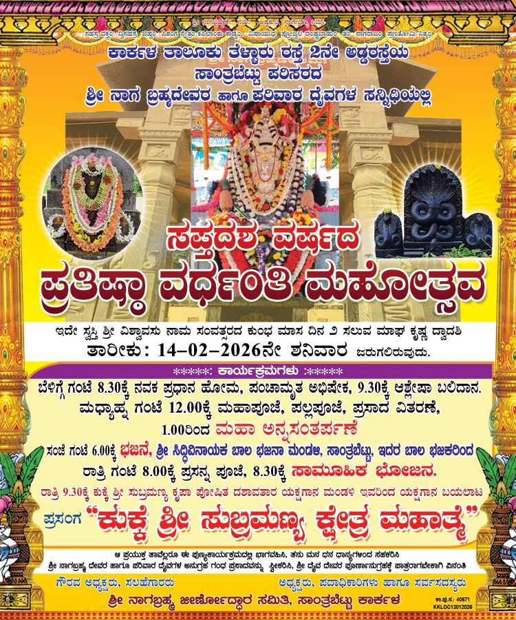 ಕಾರ್ಕಳ: ಫೆಬ್ರವರಿ 14, 2026ರ ಶನಿವಾರದಂದು ತಾಲ್ಲೂಕಿನ ಸಾಂತ್ರಬೆಟ್ಟು ಪರಿಸರದಲ್ಲಿರುವ ಶ್ರೀ ನಾಗ ಬ್ರಹ್ಮದೇವರ ಹಾಗೂ ಪರಿವಾರ ದೈವಗಳ ಸನ್ನಿಧಿಯಲ್ಲಿ ಸಪ್ತದಶ ವರ್ಷದ ಪ್ರತಿಷ್ಠಾ ವರ್ಧಂತಿ ಮಹೋತ್ಸವವು ಭಕ್ತಿಭಾವದಿಂದ ನಡೆಯಲಿದೆ. ಈ ಪವಿತ್ರ ಧಾರ್ಮಿಕ ಕಾರ್ಯಕ್ರಮವು ವಿವಿಧ ಧಾರ್ಮಿಕ ವಿಧಿವಿಧಾನಗಳೊಂದಿಗೆ ಆಯೋಜಿಸಲಾಗಿದೆ.