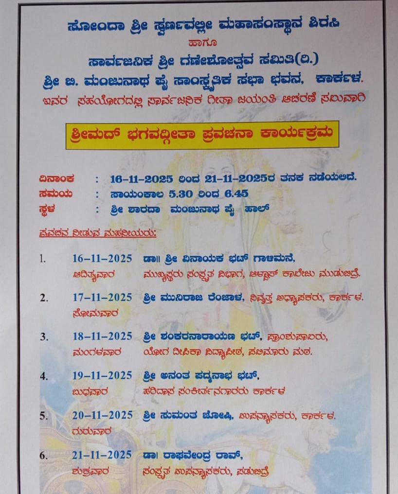 ದಿನಾಂಕ 16.11.2025 ರಿಂದ 21.11.2025 ರವರೆಗೆ ಸೋಂದಾ ಶ್ರೀ ಸ್ವರ್ಣವಲ್ಲೀ ಮಹಾಸಂಸ್ಥಾನ ಶಿರಸಿ ಹಾಗೂ ಸಾರ್ವಜನಿಕ ಶ್ರೀ ಗಣೇಶೋತ್ಸವ ಸಮಿತಿ (ರಿ), ಶ್ರೀ ಬಿ ಮಂಜುನಾಥ ಪೈ ಸಂಸ್ಕೃತಿಕ ಸಭಾ ಭವನ ಕಾರ್ಕಳ ಇದರ ಸಹಯೋಗದಲ್ಲಿ ಸಾರ್ವಜನಿಕ ಗೀತಾ ಜಯಂತಿ ಆಚರಣೆ ಸಲುವಾಗಿ ಶ್ರೀಮದ್ ಭಗವದ್ಗೀತಾ ಪ್ರವಚನ ಕಾರ್ಯಕ್ರಮ ನಡೆಯಲಿದೆ.
