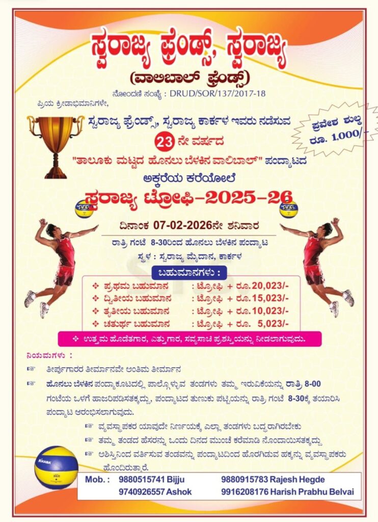 ಕಾರ್ಕಳ: ಸ್ವರಾಜ್ಯ ಫ್ರೆಂಡ್ಸ್ ಸ್ಫೋರ್ಟ್ಸ್ (ವಾಲಿಬಾಲ್ ಫ್ರೆಂಡ್ಸ್) ಸಂಘದ ಆಶ್ರಯದಲ್ಲಿ 23ನೇ ವರ್ಷದ ತಾಲ್ಲೂಕು ಮಟ್ಟದ ಹೊನಲು ಬೆಳಕಿನ ವಾಲಿಬಾಲ್ ಪಂದ್ಯಾವಳಿ ಆಯೋಜಿಸಲಾಗಿದೆ. ಈ ಪಂದ್ಯಾವಳಿ 2025–26ನೇ ಸಾಲಿನ ಅಂಗವಾಗಿ ಫೆಬ್ರವರಿ 7ರಂದು ಸಂಜೆ 8.30ರಿಂದ ನಡೆಯಲಿದೆ.