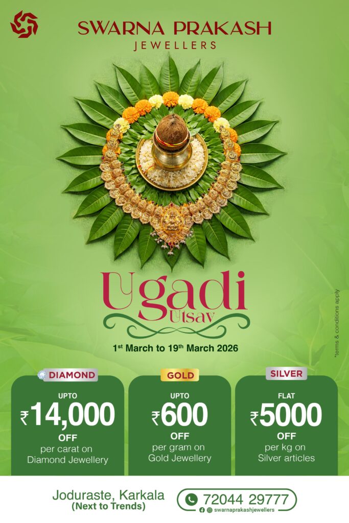 ಕಾರ್ಕಳದ ಜೋಡು ರಸ್ತೆಯಲ್ಲಿರುವ, ಸ್ವರ್ಣ ಪ್ರಕಾಶ್ ಜುವೆಲ್ಲರ್ಸ್‌ನಲ್ಲಿ ಯುಗಾದಿ ಹಬ್ಬದ ಪ್ರಯುಕ್ತ ಗ್ರಾಹಕರಿಗಾಗಿ ವಿಶೇಷ ರಿಯಾಯಿತಿಗಳೊಂದಿಗೆ ಆಕರ್ಷಕ ಆಫರ್‌ಗಳನ್ನು ನೀಡುತ್ತಿದೆ .