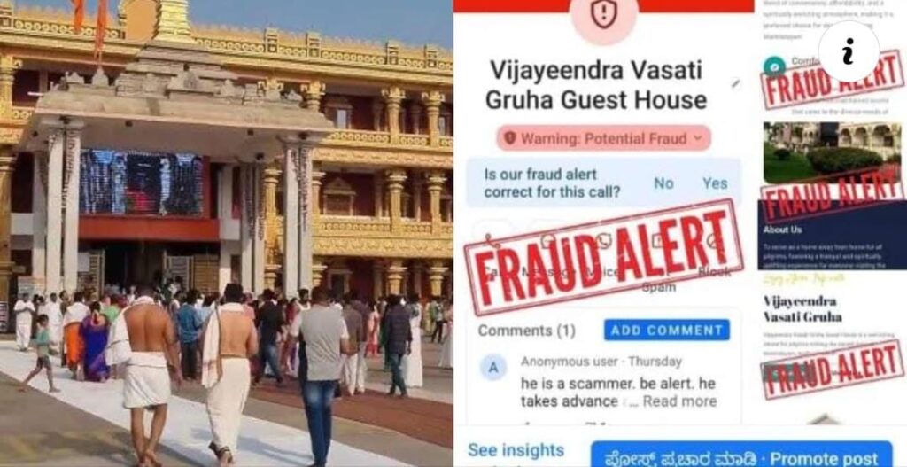 ಹಾಸನ ಜಿಲ್ಲೆಯ ಅರಸೀಕೆರೆ ಮೂಲದ ಅಕ್ಷಿತಾ ಎಂಬುವರಿಗೆ ಆನ್ಲೈನ್ ಬುಕ್ಕಿಂಗ್ ಹೆಸರಲ್ಲಿ ಮುಂಗಡವಾಗಿ 2000 ರೂ. ಜಮೆ ಮಾಡಿಸಿಕೊಂಡು ಬಳಿಕ ಪ್ರತಿಕ್ರಿಯೆ ನೀಡದೆ ವಂಚಿಸಲಾಗಿದ್ದು ಈ ಬಗ್ಗೆ ಎಚ್ಚರವಹಿಸುವಂತೆ ಮಂತ್ರಾಲಯ ಮಠದಿಂದ ಭಕ್ತರಿಗೆ ಸಲಹೆ ನೀಡಲಾಗಿದೆ.