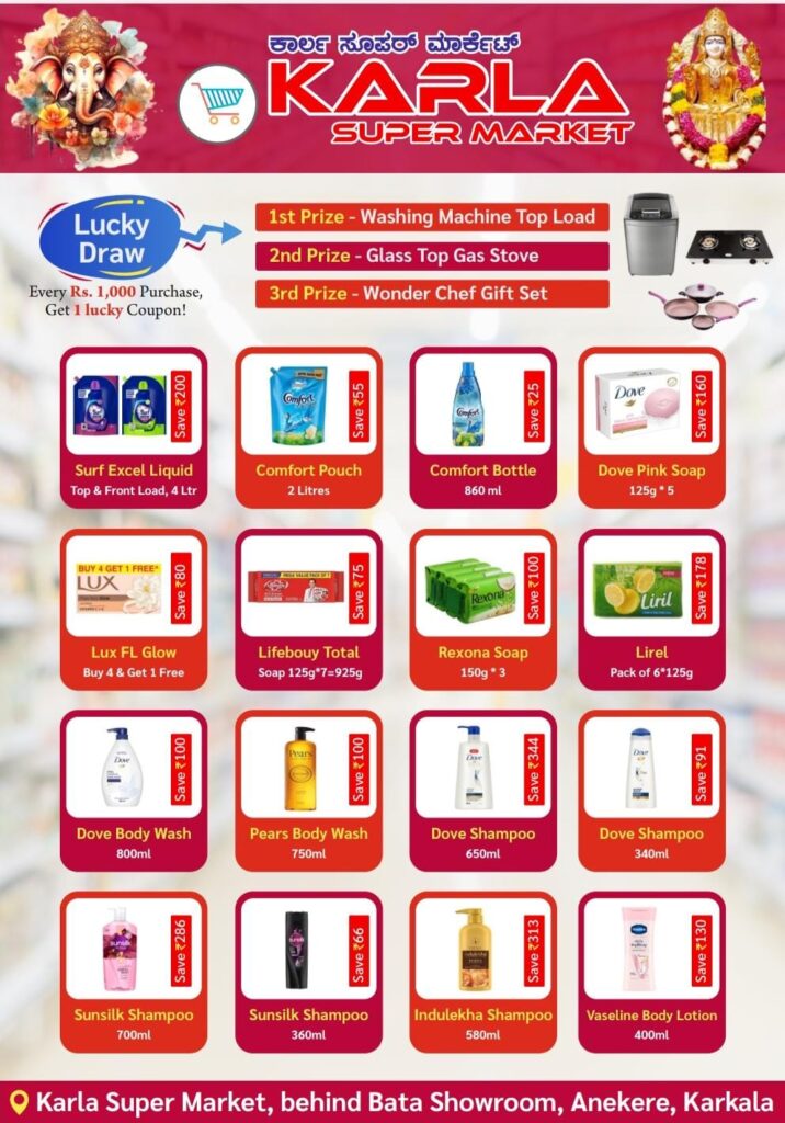 ಒಂದೇ ಸೂರಿನಡಿ ಅತ್ಯುತ್ತಮ ಗುಣಮಟ್ಟದಿಂದ ಕೂಡಿದ ಎಲ್ಲಾ ರೀತಿಯ ಗೃಹಪಯೋಗಿ ವಸ್ತುಗಳು ಇಲ್ಲಿ ಲಭ್ಯವಿದ್ದು, ಸಕ್ಕರೆ, ಬೆಲ್ಲ, ಅವಲಕ್ಕಿ, ಉದ್ದಿನ ಬೇಳೆ, ಹೆಸರುಬೇಳೆ, ಸೋಪ್, ಶಾಂಪು, ಹಾರ್ಲಿಕ್ಸ್ ಸೇರಿದಂತೆ ದಿನನಿತ್ಯ ಬಳಕೆಗೆ ಬೇಕಾಗುವಂತಹ ವಸ್ತುಗಳೊಂದಿಗೆ ಗೃಹೋಪಯೋಗಿ ವಸ್ತುಗಳ ಮೇಲೆ ಆಕರ್ಷಕ ರಿಯಾಯಿತಿ ದರ ಇರಲಿದೆ.ಗ್ರಾಹಕರು ಇದರ ಸದುಪಯೋಗವನ್ನು ಪಡೆದುಕೊಳ್ಳಬೇಕಾಗಿ ಕಾರ್ಲಾ ಸೂಪರ್ ಮಾರ್ಕೆಟ್ ವಿನಂತಿಯಾಗಿದೆ.