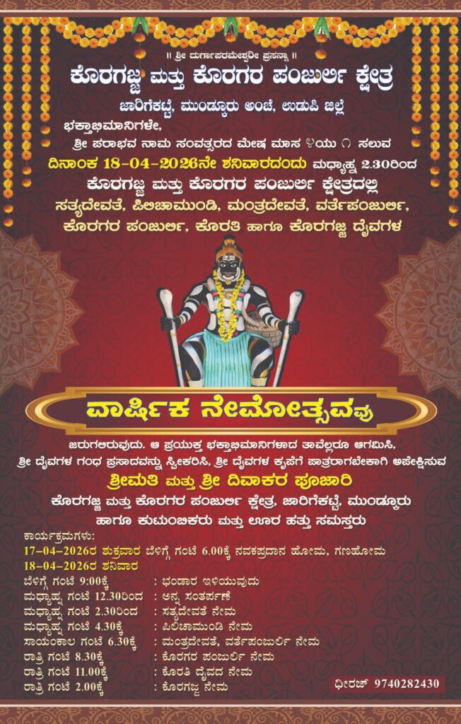 ಏಪ್ರಿಲ್ 18 ಶನಿವಾರದಂದು ಜಾರಿಗೆ ಕಟ್ಟೆಯ ಕೊರಗಜ್ಜ ಮತ್ತು ಕೊರಗರ ಪಂಜುರ್ಲಿ ಕ್ಷೇತ್ರದಲ್ಲಿ ಸತ್ಯದೇವತೆ, ಪಿಲಿಚಾಮುಂಡಿ, ಮಂತ್ರ ದೇವತೆ, ವರ್ತಪಂಜುರ್ಲಿ, ಕೊರಗರ ಪಂಜುರ್ಲಿ, ಕೊರತಿ ಹಾಗೂ ಕೊರಗಜ್ಜ ದೈವಗಳ ವಾರ್ಷಿಕ ನೇಮೋತ್ಸವ ನಡೆಯಲಿದೆ.