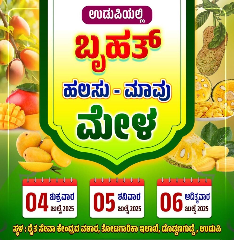 ಹಲಸು – ಮಾವು – ಕೃಷಿ – ಕರಕುಶಲ, ಸಾಂಪ್ರದಾಯಿಕ ಬೆಳೆ ಮತ್ತು ತಿಂಡಿ ತಿನಿಸುಗಳನ್ನು ಈ ಬಿರುಸಿನ ಮಳೆಗಾಲದಲ್ಲೂ ಉಡುಪಿಯ ಜನರಿಗೆ ಒದಗಿಸುವ ಸಲುವಾಗಿ ಬೃಹತ್ ಹಲಸು – ಮಾವು – ಕೃಷಿ – ಕೌಶಲ ಮೇಳವು ದಿನಾಂಕ: 4, 5 ಮತ್ತು 6 ರಂದು ರೈತ ಸೇವಾ ಕೇಂದ್ರದ ವಠಾರ, ತೋಟಗಾರಿಕಾ ಇಲಾಖೆ, ದೊಡ್ಡಣಗುಡ್ಡೆ, ಉಡುಪಿ ಇಲ್ಲಿ ಆಯೋಜಿಸಲಾಗಿದೆ.