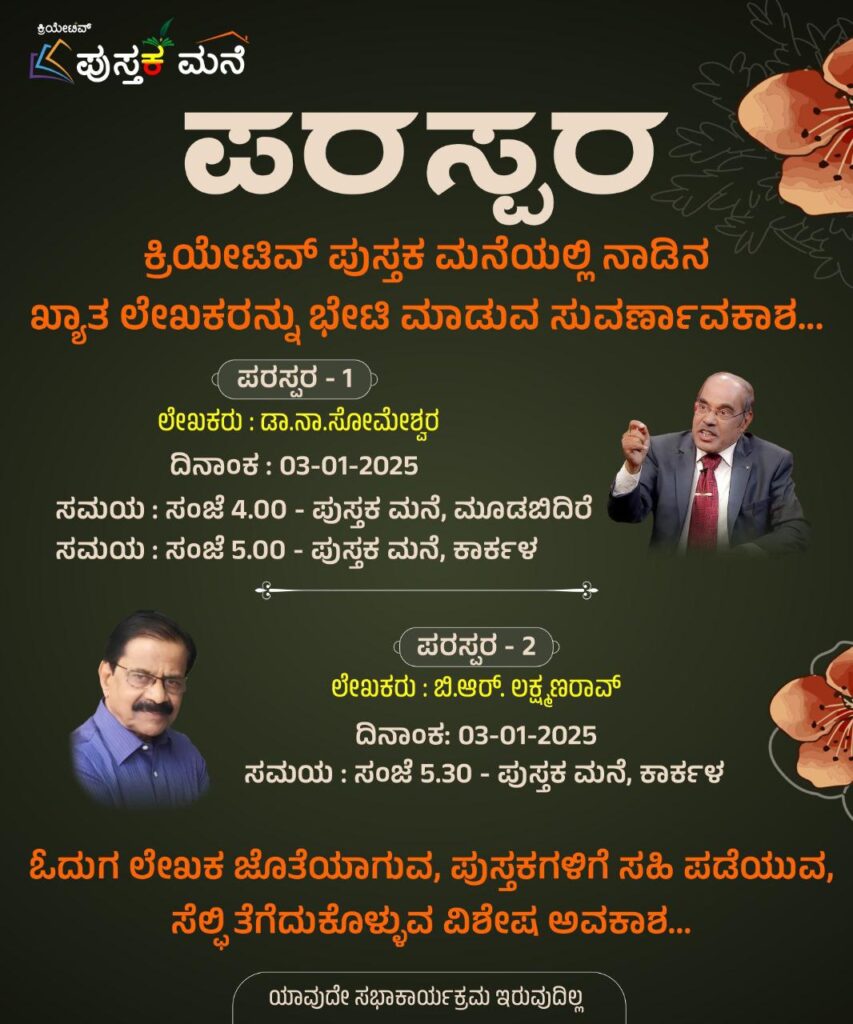ಜ. 3ಕ್ಕೆ, ಕ್ರಿಯೇಟಿವ್ ಪುಸ್ತಕ ಮನೆಯ “ಪರಸ್ಪರ”ದಲ್ಲಿ ಡಾ.ನಾ ಸೋಮೇಶ್ವರ ಮತ್ತು ಕನ್ನಡದ ಪ್ರೇಮ ಕವಿ ಬಿ.ಆರ್ .ಲಕ್ಷ್ಮಣರಾವ್