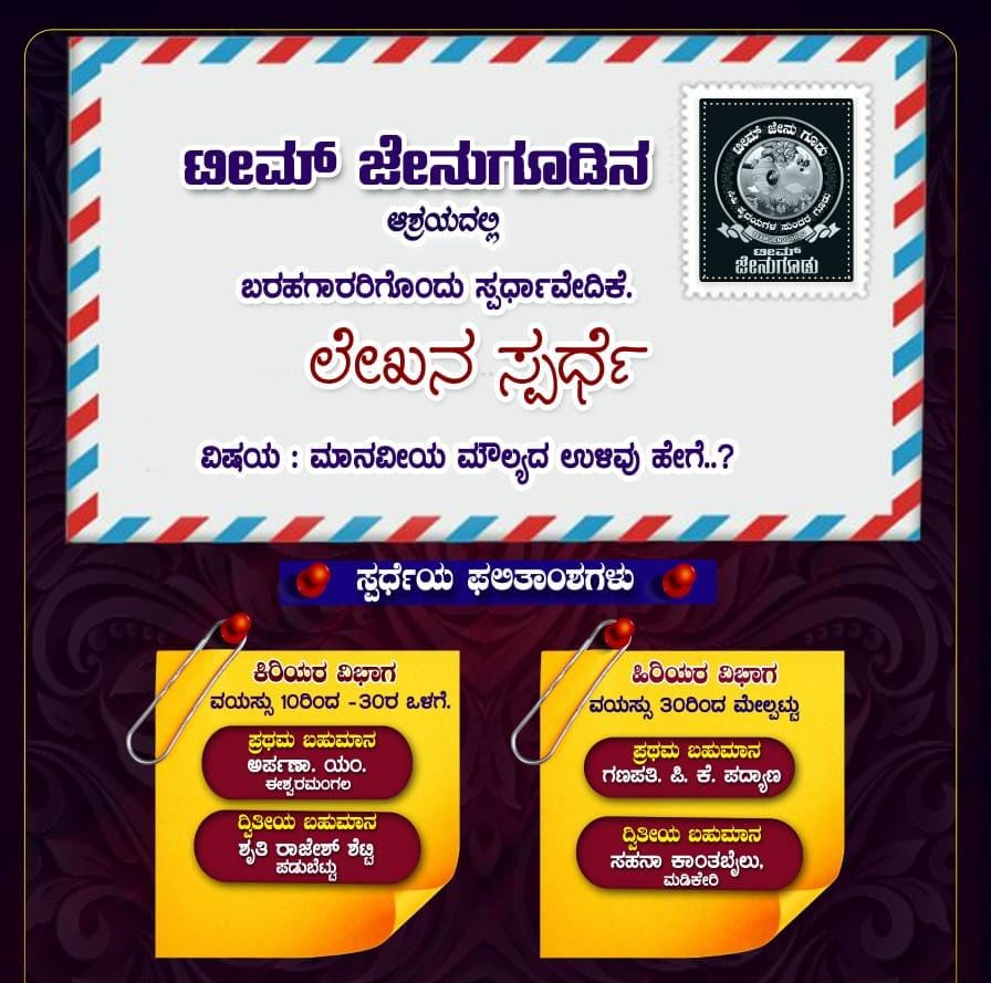 “ಟೀಮ್ ಜೇನುಗೂಡು ಆಯೋಜಿಸಿದ ಲೇಖನ ಸ್ಪರ್ಧೆಯಲ್ಲಿ ಭಾಗವಹಿಸಿ ವಿಜೇತರಾದವರಿಗೆ ಅಭಿನಂದನೆಗಳು….