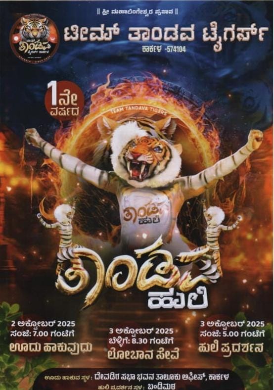 ಟೀಮ್ ತಾಂಡವ ಟೈಗರ್ಸ್ ಕಾರ್ಕಳ ವತಿಯಿಂದ 1 ನೇ ವರ್ಷದ ತಾಂಡವ ಹುಲಿ ಕಾರ್ಯಕ್ರಮವು ಕಾರ್ಕಳದಲ್ಲಿ ನಡೆಯಲಿದೆ.