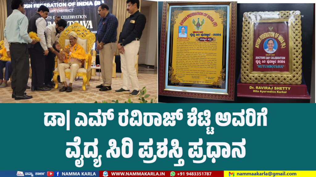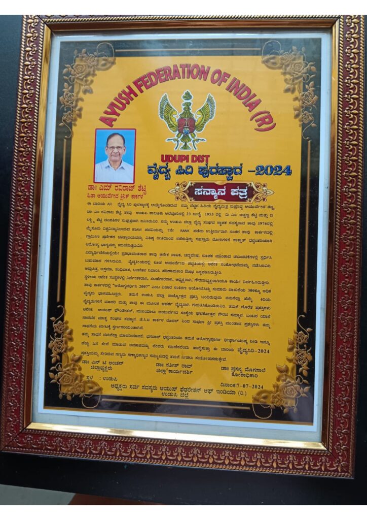 ಆಯುಷ್ ಫೆಡರೇಶನ್ ಆಫ್ ಇಂಡಿಯಾ ಉಡುಪಿ ಶಾಖೆಯ ವತಿಯಿಂದ ವೈದ್ಯರ ದಿನಾಚರಣೆ ಹಾಗೂ ಕುಟುಂಬೋತ್ಸವ ದಿನಾಚರಣೆಯು ದಿನಾಂಕ 7-7.2024ರಂದು ಮಣಿಪಾಲ್ ಇನ್ ಹೋಟೆಲ್ ನಲ್ಲಿ ಜರಗಿತು.ಆ ಕಾರ್ಯಕ್ರಮದಲ್ಲಿ ಡಾಕ್ಟರ್ ಎಮ್ ರವಿರಾಜ್ ಶೆಟ್ಟಿ ಹಿತ ಆಯುರ್ವೇದಿಕ್ಸ್ ಕಾರ್ಕಳ ಇವರನ್ನು ವೈದ್ಯ ಸಿರಿ -2024 ಪ್ರಶಸ್ತಿಯನ್ನು ನೀಡಿ ಅವರ ಅವಿರತ ವೈದ್ಯಕೀಯ ಸೇವೆಗಾಗಿ ಪ್ರಶಸ್ತಿ ನೀಡಿ ಗೌರವಿಸಲಾಯಿತು. ಡಾಕ್ಟರ್ ಕೃಷ್ಣಪ್ರಸಾದ್ ಪ್ರಸಾದ್ ನೇತ್ರಾಲಯ ಉಡುಪಿ, ಕಲಾವಿದ ಪ್ರಸನ್ನ ಶೆಟ್ಟಿ ಬೈಲೂರು ಹಾಗೂ ಗಿರಿಜಾ ಸರ್ಜಿಕಲ್ ನ ಮಾಲಕರಾದ ರವೀಂದ್ರ ಶೆಟ್ಟಿ ಇವರು ಸನ್ಮಾನವನ್ನು ನೆರವೇರಿಸಿದರು. ಸಮಾರಂಭದ ಅಧ್ಯಕ್ಷತೆಯನ್ನು ಸಂಘದ ಅಧ್ಯಕ್ಷರಾದ ಡಾಕ್ಟರ್ ಏನ್ ಟಿ ಅಂಚನ್ ಇವರು ವಹಿಸಿದ್ದರು