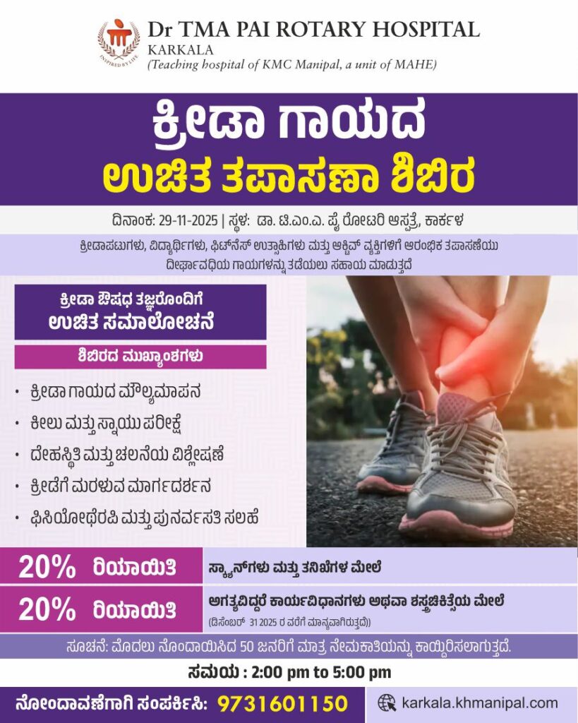 ಕಾರ್ಕಳ ನವೆಂಬರ್ 27: ಕಾರ್ಕಳದ ಡಾ. ಟಿಎಂಎ ಪೈ ರೋಟರಿ ಆಸ್ಪತ್ರೆಯು ನವೆಂಬರ್ 29, 2025 ರಂದು ಉಚಿತವಾಗಿ ಕ್ರೀಡಾ ಗಾಯಗಳ ತಪಾಸಣಾ ಶಿಬಿರವನ್ನು ಆಯೋಜಿಸಿದೆ, ಇದನ್ನು ಕ್ರೀಡಾಪಟುಗಳು, ವಿದ್ಯಾರ್ಥಿಗಳು, ಫಿಟ್‌ನೆಸ್ ಉತ್ಸಾಹಿಗಳು ಮತ್ತು ಕ್ರೀಡೆಗಳಿಗೆ ಸಂಬಂಧಿಸಿದ ಗಾಯಗಳನ್ನು ತಡೆಗಟ್ಟಲು ಅಥವಾ ನಿರ್ವಹಿಸಲು ಬಯಸುವ ಸಕ್ರಿಯ ವ್ಯಕ್ತಿಗಳಿಗಾಗಿ ವಿನ್ಯಾಸಗೊಳಿಸಲಾಗಿದೆ. ಈ ಶಿಬಿರವನ್ನು 29 ನವೆಂಬೆರ್ 2025 ಶನಿವಾರದಂದು ಡಾ ಟಿ ಎಂ ಎ ಪೈ ರೋಟರಿ ಆಸ್ಪತ್ರೆಯಲ್ಲಿ ಮಧ್ಯಾಹ್ನ 2:00 ರಿಂದ ಸಂಜೆ 5:00 ರವರೆಗೆ ನಡೆಯಲಿದೆ, ಭಾಗವಹಿಸುವವರಿಗೆ ಕ್ರೀಡಾ ಔಷಧ ತಜ್ಞರೊಂದಿಗೆ ಉಚಿತ ಸಮಾಲೋಚನೆಯನ್ನು ನೀಡಲಾಗುತ್ತದೆ. ಶಿಬಿರದಲ್ಲಿ ಕ್ರೀಡಾ ಗಾಯದ ಮೌಲ್ಯಮಾಪನ, ಕೀಲು ಮತ್ತು ಸ್ನಾಯು ಪರೀಕ್ಷೆ, ದೇಹಸ್ಥಿತಿ  ಮತ್ತು ಚಲನೆಯ ವಿಶ್ಲೇಷಣೆ, ಕ್ರೀಡೆಗೆ ಮರಳುವ ಮಾರ್ಗದರ್ಶನ, ಭುಜ, ಗಂಟು ಮತ್ತು ನಿರಂತರ ಬೆನ್ನು ನೋವಿನ ತಪಾಸಣೆ, ಫಿಸಿಯೋಥೆರಪಿ ಹಾಗೂ ಪುನಶ್ಚೇತನಾ ಸಲಹೆಗಳು ಸೇರಿವೆ. ಈ ಉಚಿತ ಸೇವೆಗಳ ಜೊತೆಗೆ, ಆಸ್ಪತ್ರೆಯು ಅವಶ್ಯ ಸ್ಕ್ಯಾನ್‌ಗಳು ಮತ್ತು ಪರೀಕ್ಷೆಗಳ ಮೇಲೆ 20% ರಿಯಾಯಿತಿ ಹಾಗೂ ಅಗತ್ಯವಿದ್ದರೆ ಕಾರ್ಯವಿಧಾನಗಳು ಅಥವಾ ಶಸ್ತ್ರಚಿಕಿತ್ಸೆಯ ಮೇಲೆ 20% ರಿಯಾಯಿತಿಯನ್ನು ನೀಡಲಿದೆ. ಶಸ್ತ್ರಚಿಕಿತ್ಸೆಯ ರಿಯಾಯಿತಿ ಡಿಸೆಂಬರ್ 31, 2025 ರವರೆಗೆ ಮಾನ್ಯವಾಗಿರುತ್ತದೆ.