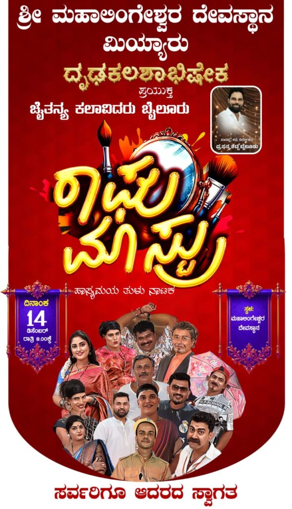 ಡಿಸೆಂಬರ್ 14ರಂದು ಶ್ರೀ ಮಹಾಲಿಂಗೇಶ್ವರ ದೇವಸ್ಥಾನ ಮಿಯಾರಿನ ದೃಢಕಲಶಾಭಿಷೇಕದ ಪ್ರಯುಕ್ತ ರಾತ್ರಿ 8:00ಗೆ ಚೈತನ್ಯ ಕಲಾವಿದರು ಬೈಲೂರು ಇವರಿಂದ ‘ರಾಘು ಮಾಸ್ಟ್ರು’ ಎಂಬ ಹಾಸ್ಯಮಯ ತುಳು ನಾಟಕ ನಡೆಯಲಿದೆ.