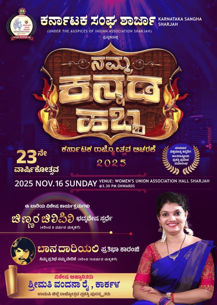 ದುಬೈ : ದಿನಾಂಕ 16/11/2025 ರಂದು ಶಾರ್ಜಾದ ವುಮೇನ್ಸ್ ಯುನಿಯನ್ ಅಸೋಸಿಯೇಶನ್ ನ ಸಭಾಂಗಣದಲ್ಲಿ ಸಂಜೆ 3.30 ರಿಂದ ಶಾರ್ಜಾ ಕರ್ನಾಟಕ ಸಂಘದ 23 ನೇ ವರ್ಷದ ಕರ್ನಾಟಕ ರಾಜ್ಯೋತ್ಸವದ ಕಾರ್ಯಕ್ರಮ ಜರುಗಲಿದ್ದು, ಮುಖ್ಯ ಅತಿಥಿಯಾಗಿ ಉಡುಪಿ ಜಿಲ್ಲಾ ರಾಜ್ಯೋತ್ಸವ ಪ್ರಶಸ್ತಿ ಪುರಸ್ಕೃತರಾದ ಶಿಕ್ಷಕಿ ಶ್ರೀಮತಿ ವಂದನಾ ರೈ ಕಾರ್ಕಳ ಇವರು ಆಗಮಿಸಲಿದ್ದಾರೆ.