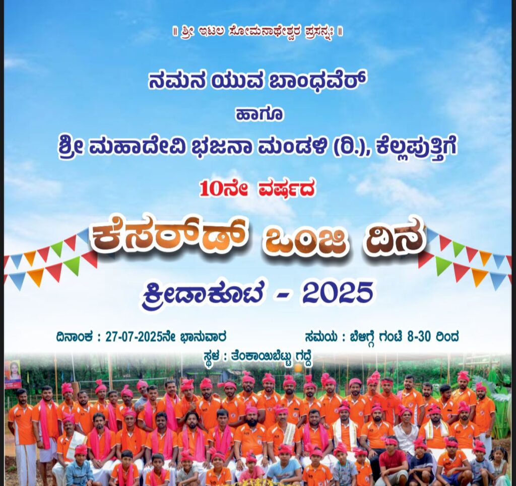ದಿನಾಂಕ 27.07.2025 ನೇ ಭಾನುವಾರದಂದು ನಮನ ಯುವ ಬಾಂಧವೆರ್ ಹಾಗೂ ಶ್ರೀ ಮಹಾದೇವಿ ಭಜನಾ ಮಂಡಳಿ (ರಿ.) ಕೆಲ್ಲಪುತ್ತಿಗೆ ಇದರ ಹತ್ತನೇ ವರ್ಷದ ಕೆಸರ್ಡ್ ಒಂಜಿ ದಿನ ಕ್ರೀಡಾಕೂಟ ತೆಂಕಾಯಿಬೆಟ್ಟು ಗದ್ದೆಯಲ್ಲಿ ನಡೆಯಲಿದೆ.
