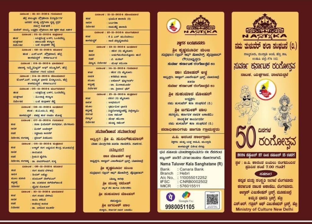 ನಮ ತುಳುವೆರ್ ಕಲಾ ಸಂಘಟನೆ ರಿ. ನಾಟ್ಕದೂರು, ಮುದ್ರಾಡಿ ಹೆಬ್ರಿ ವತಿಯಿಂದ ಸುವರ್ಣ ಕರ್ನಾಟಕ ರಂಗೋತ್ಸವ (ನಾಟಕ, ಯಕ್ಷಗಾನ, ತಾಳಮದ್ದಳೆ “50 ದಿನಗಳ ರಂಗೋತ್ಸವ”ಸೆಪ್ಟೆಂಬರ್ 27ರಿಂದ ನವಂಬರ್ 15ರವರೆಗೆ ಸ್ಥಳ ಬಿ.ವಿ ಕಾರಂತ ಬಯಲು ರಂಗ ಮಂದಿರ ಇಲ್ಲಿ ಪ್ರತಿದಿನ ಸಂಜೆ 7 ಗಂಟೆಗೆ ನಡೆಯಲಿದೆ.