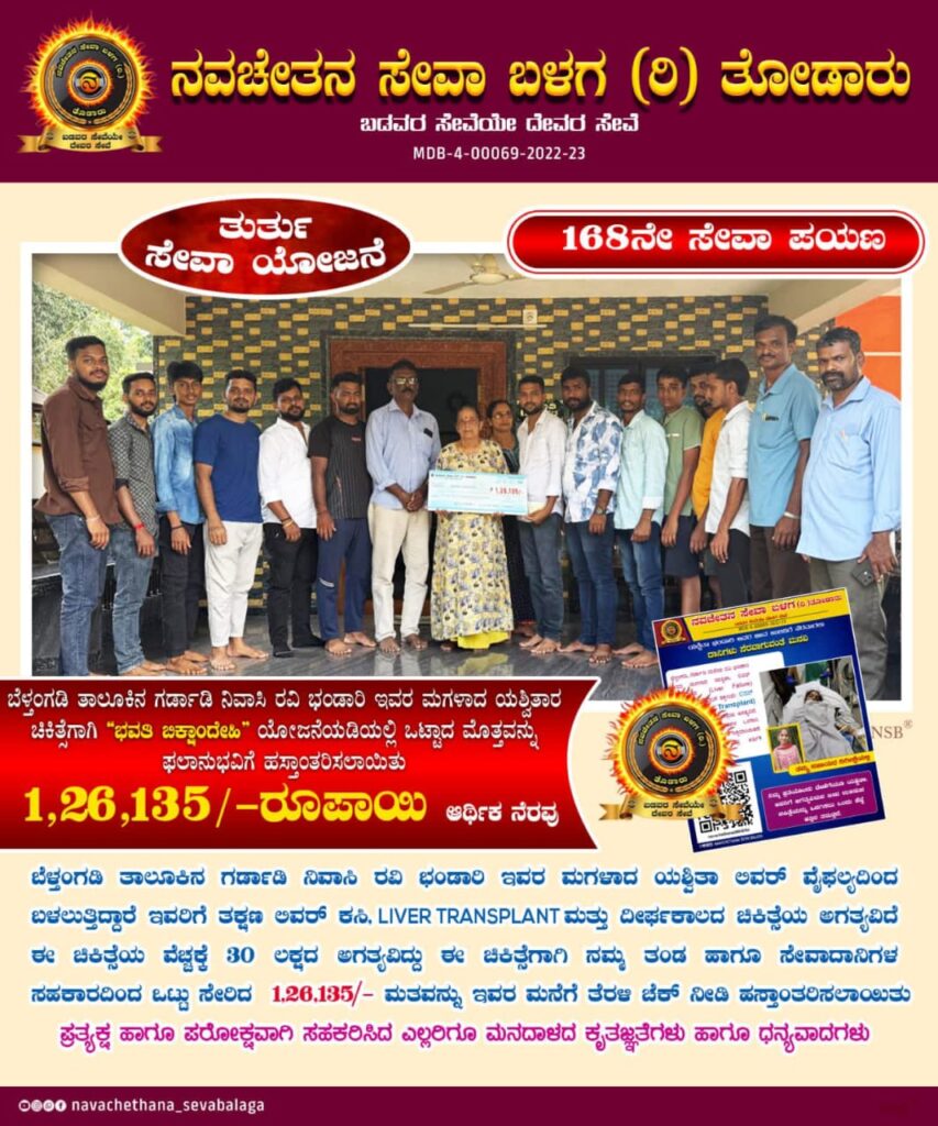 ಬೆಳ್ತಂಗಡಿ ತಾಲೂಕಿನ ಗರ್ಡಾಡಿ ನಿವಾಸಿ ರವಿ ಭಂಡಾರಿ ಇವರ ಮಗಳಾದ ಯಶ್ವಿತಾ ಲಿವರ್ ವೈಫಲ್ಯದಿಂದ ಬಳಲುತ್ತಿದ್ದು ಇವರಿಗೆ ತಕ್ಷಣ ಲಿವರ್ ಕಸಿ, (LIVER TRANSPLANT) ಮತ್ತು ದೀರ್ಘಕಾಲದ ಚಿಕಿತ್ಸೆಯ ಅಗತ್ಯವಿದ್ದು ,ಚಿಕಿತ್ಸೆಯ ವೆಚ್ಚಕ್ಕೆ 30 ಲಕ್ಷದ ಅಗತ್ಯವಿದ್ದದನ್ನು ಮನಗಂಡ ನವಚೇತನ ಸೇವಾ ಬಳಗ (ರಿ) ತೋಡಾರು ಹಾಗೂ ಸೇವಾದಾನಿಗಳ ಸಹಕಾರದಿಂದ ಒಟ್ಟು ಸೇರಿದ 1,26,135 ಮೊತ್ತವನ್ನು ಇವರ ಮನೆಗೆ ತೆರಳಿ ಚೆಕ್ ನೀಡಿ ಹಸ್ತಾಂತರಿಸಿದ್ದಾರೆ