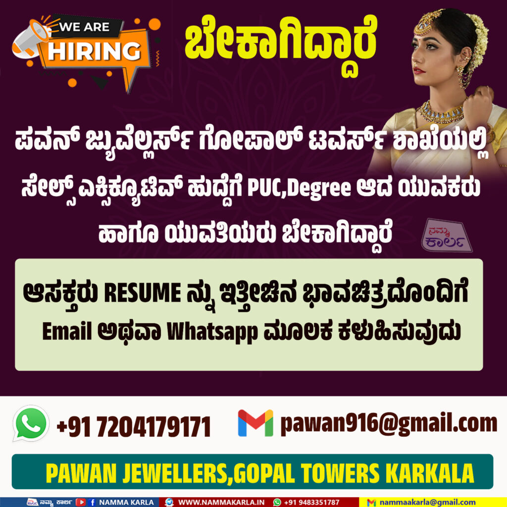 ಕಾರ್ಕಳ: ತಾಲೂಕಿನಲ್ಲಿ ಕಾರ್ಯನಿರ್ವಹಿಸುತ್ತಿರುವ ಪ್ರತಿಷ್ಠಿತ ಚಿನ್ನದ ಮಳಿಗೆ ಪವನ್ ಜ್ಯುವೆಲ್ಲರ್ಸ್ ಗೋಪಾಲ್ ಟವರ್ಸ್ ಶಾಖೆಯಲ್ಲಿ ಸೇಲ್ಸ್ ಎಕ್ಸಿಕ್ಯೂಟಿವ್ ಹುದ್ದೆಗೆ ಪಿಯುಸಿ,ಡಿಗ್ರಿ ಆದ ಯುವಕರು ಹಾಗೂ ಯುವತಿಯರು ಬೇಕಾಗಿದ್ದಾರೆ.