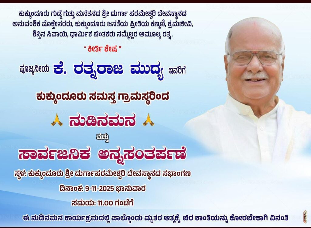 ದಿನಾಂಕ 9.11.2025 ನೇ ಭಾನುವಾರದಂದು ಕುಕ್ಕುಂದೂರು ಶ್ರೀ ದುರ್ಗಾಪರಮೇಶ್ವರಿ ದೇವಸ್ಥಾನದ ಸಭಾಂಗಣದಲ್ಲಿ ಗುಡ್ಡೆ ಗುತ್ತು ಮನೆತನದ ಶ್ರೀ ದುರ್ಗಾಪರಮೇಶ್ವರಿ ದೇವಸ್ಥಾನದ ಅನುವಂಶಿಕ ಮೊಕ್ತೇಸರರಾದ ಪೂಜ್ಯನಿಯ ಕೆ.ರತ್ನರಾಜ ಮುದ್ಯ ಅವರ ಆತ್ಮಕ್ಕೆ ಚಿರಶಾಂತಿಯನ್ನು ಕೋರುವ ನುಡಿ ನಮನ ಕಾರ್ಯಕ್ರಮ ನಡೆಯಲಿದೆ.