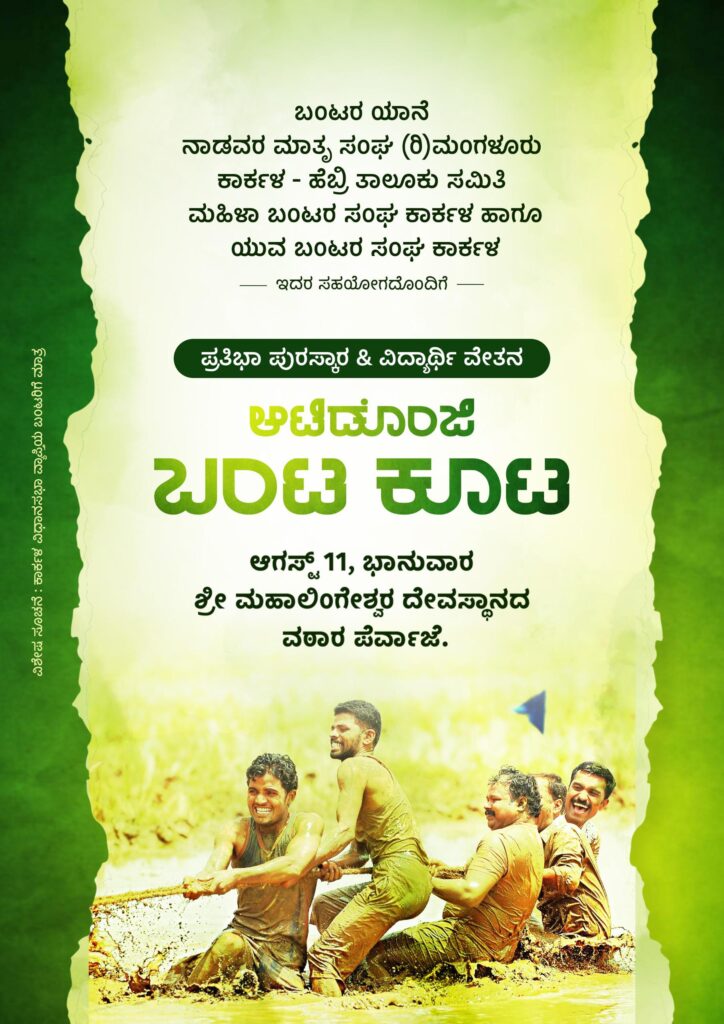 ಬಂಟರ ಯಾನೆ ನಾಡವರ ಮಾತೃ ಸಂಘ (ರಿ.) ಮಂಗಳೂರು ಕಾರ್ಕಳ ಹೆಬ್ರಿ ತಾಲೂಕು ಸಮಿತಿ ಕಾರ್ಕಳ, ಕಾರ್ಕಳ ತಾಲೂಕು ಬಂಟ ಮಹಿಳಾ ಸಂಘ ಕಾರ್ಕಳ, ಯುವ ಬಂಟರ ಸಂಘ ಕಾರ್ಕಳ ಸಹಯೋಗದಲ್ಲಿ ವಿದ್ಯಾರ್ಥಿ ವೇತನ ,ಪ್ರತಿಭಾ ಪುರಸ್ಕಾರ ಮತ್ತು ಆಟಿಡೊಂಜಿ ಕೆಸರ್ದಕೂಟ ದಿ.11 ಆದಿತ್ಯವಾರ, ಶ್ರೀ ಮಹಾಲಿಂಗೇಶ್ವರ ದೇವಸ್ಥಾನ ಪೆರ್ವಾಜೆ ಕಾರ್ಕಳ ಇಲ್ಲಿ ನಡೆಯಲಿರುವುದು.