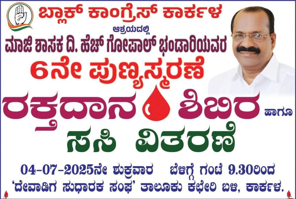 ಮಾಜಿ ಶಾಸಕ ದಿ. ಹೆಚ್ ಗೋಪಾಲ ಭಂಡಾರಿಯವರ 6ನೇ ಪುಣ್ಯಸ್ಮರಣೆಯ ಪ್ರಯುಕ್ತ ರಕ್ತದಾನ ಶಿಬಿರ ಹಾಗೂ ಸಸಿ ವಿತರಣೆ ಕಾರ್ಯಕ್ರಮವನ್ನು ದಿನಾಂಕ 4 ಜುಲೈ ಶುಕ್ರವಾರ ಬೆಳಿಗ್ಗೆ 9:30 ರಿಂದ ದೇವಾಡಿಗ ಸುಧಾರಕ ಸಂಘ (ರಿ) ತಾಲೂಕು ಕಚೇರಿ ಬಳಿ ಇದರ ಸಭಾಂಗಣದಲ್ಲಿ ಆಯೋಜಿಸಲಾಗಿದೆ.