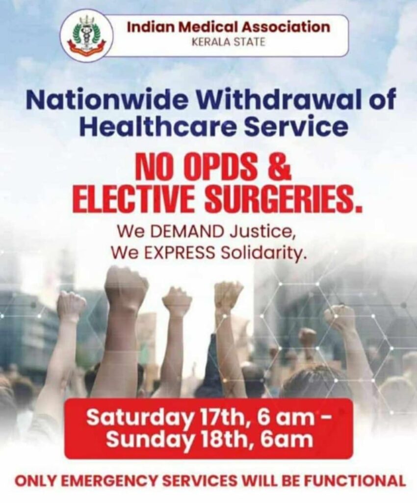 ಈ ಘಟನೆಯು ಇಡೀ ದೇಶದಾದ್ಯಂತ ಆಕ್ರೋಶದ ಅಲೆಯನ್ನ ಉಂಟುಮಾಡಿದ್ದು ಸಮಾಜದ ಹಿತಕ್ಕಾಗಿ ಹಗಲು ರಾತ್ರಿ ಎನ್ನದೆ ದುಡಿಯುವ ವೈದ್ಯ ಸಮೂಹದ ಮೇಲೆ ಇದು ಭಾರಿ ಆಘಾ..ತವನ್ನು ಉಂಟುಮಾಡಿದೆ. ಈ ಘಟನೆಯ ಕುರಿತು ಅಖಿಲ ಭಾರತೀಯ ವೈದ್ಯಕೀಯ ಸಂಘವು ಆಗಸ್ಟ್ 9 ರಿಂದಲೂ ನಿರಂತರವಾಗಿ ಪ್ರತಿಭಟನೆಯಲ್ಲಿ ತೊಡಗಿದೆ. ಈ ಪ್ರತಿಭ..ಟನೆಗಳ ಮುಂದಿನ ಹೆಜ್ಜೆಯಾಗಿ ದಿನಾಂಕ 17/08/2024 ರಂದು ಶನಿವಾರ ಬೆಳಗ್ಗೆ 6 ಯಿಂದ ಮರುದಿನ ಬೆಳಗ್ಗೆ 6 ವರೆಗೆ ಇಡೀ ದೇಶದಾದ್ಯಂತ ಹೊರರೋಗಿಗಳ ಚಿಕಿತ್ಸೆ ಯನ್ನು ವೈದ್ಯ ಸಮೂಹವು ಸ್ಥಗಿತಗೊಳಿಸಲಿದೆ.