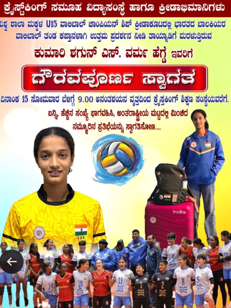 ಡಿಸೆಂಬರ್ 4 ರಿಂದ 13 ವರಗೆ ಚೀನಾದಲ್ಲಿ ನಡೆದ ವಿಶ್ವ ಶಾಲಾ‌ ಮಕ್ಕಳ U15 ವಾಲಿಬಾಲ್ ಚಾಂಪಿಯನ್ ಶಿಪ್ ಕ್ರೀಡಾಕೂಟದಲ್ಲಿ ಭಾರತದ ಬಾಲಕಿಯರ ವಾಲಿಬಾಲ್ ತಂಡದ ಕಪ್ತಾನಳಾಗಿ ತಂಡವನ್ನು ಮುನ್ನಡೆಸಿ ಉತ್ತಮ ಪ್ರದರ್ಶನ ನೀಡಿದ ಕರ್ನಾಟಕದ ಮೊದಲ ಆಟಗಾರ್ತಿ ಎಂಬ ಹೆಗ್ಗಳಿಕೆಗೆ ಪಾತ್ರರಾದ ಕ್ರೈಸ್ತಕಿಂಗ್ ಶಿಕ್ಷಣ ಸಂಸ್ಥೆಯ 9ನೇ ತರಗತಿ ವಿದ್ಯಾರ್ಥಿನಿ ಶಗುನ್ ಎಸ್‌ ವರ್ಮ ಹೆಗ್ಡೆ ತಾಯ್ನಾಡಿಗೆ ಮರಳುತ್ತಿರುವ ಸಂದರ್ಭದಲ್ಲಿ ಅವರನ್ನು ಗೌರವಪೂರ್ಣವಾಗಿ ಸ್ವಾಗತಿಸುವ ಸಲುವಾಗಿ ದಿನಾಂಕ 15 ಸೋಮವಾರ ಬೆಳಿಗ್ಗೆ 9:00ಕ್ಕೆ ಅನಂತಶಯನ ವೃತ್ತದಿಂದ ಕ್ರೈಸ್ತಕಿಂಗ್ ಶಿಕ್ಷಣ ಸಂಸ್ಥೆಯವರೆಗೆ ಸ್ವಾಗತ ಮೆರವಣಿಯನ್ನು ಶಿಕ್ಷಣ ಸಂಸ್ಥೆ ಹಾಗೂ ಕ್ರೀಡಾಭಿಮಾನಿಗಳ ವತಿಯಿಂದ ಆಯೋಜಿಸಲಾಗಿದೆ.