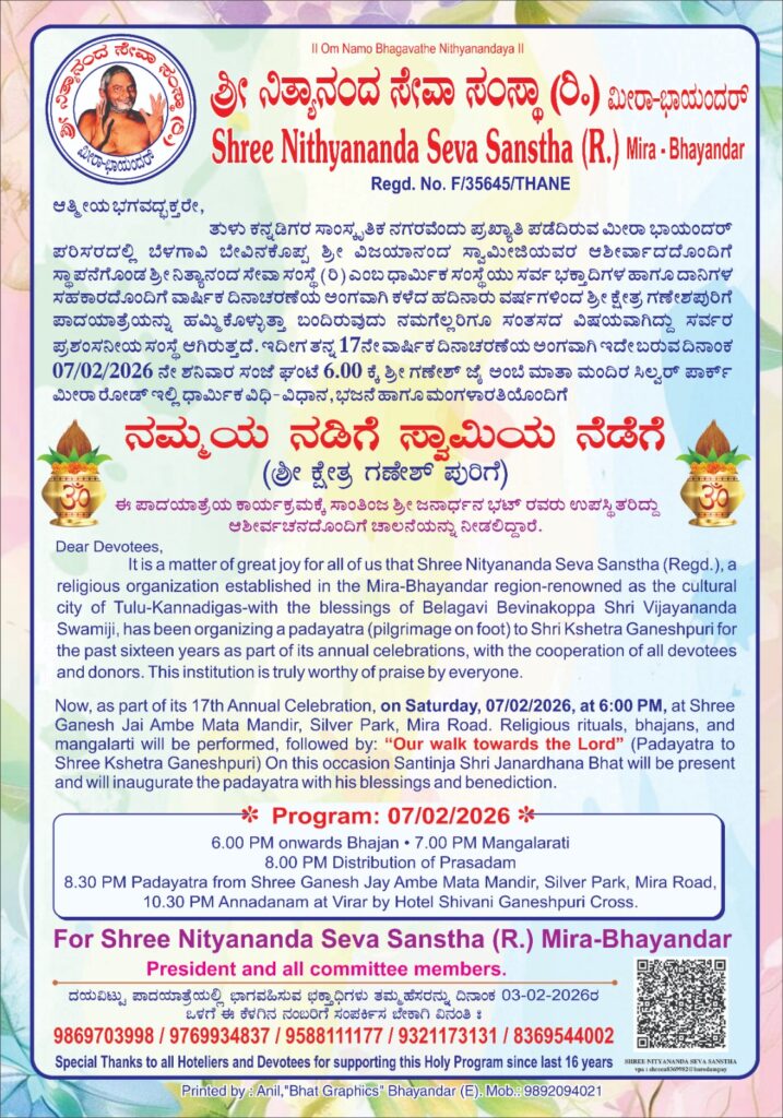ತುಳು–ಕನ್ನಡಿಗರ ಸಾಂಸ್ಕೃತಿಕ ನಗರವೆಂದು ಹೆಸರಾದ ಮೀರಾ–ಭಾಯಂದರ್ ಪ್ರದೇಶದಲ್ಲಿ ಕಾರ್ಯನಿರ್ವಹಿಸುತ್ತಿರುವ ಶ್ರೀ ನಿತ್ಯಾನಂದ ಸೇವಾ ಸಂಸ್ಥೆ (ರಿ.) ತನ್ನ 17ನೇ ವಾರ್ಷಿಕ ದಿನಾಚರಣೆಯನ್ನು ಭಕ್ತಿಪೂರ್ಣವಾಗಿ ಆಚರಿಸಲು ಸಜ್ಜಾಗಿದೆ. ಬೆಳಗಾವಿ ಬೇವಿನಕೊಪ್ಪದ ಶ್ರೀ ವಿಜಯಾನಂದ ಸ್ವಾಮೀಜಿಯವರ ಆಶೀರ್ವಾದದೊಂದಿಗೆ ಸ್ಥಾಪನೆಯಾದ ಈ ಧಾರ್ಮಿಕ ಸಂಸ್ಥೆ, ಭಕ್ತಾದಿಗಳು ಹಾಗೂ ದಾನಿಗಳ ಸಹಕಾರದಿಂದ ಕಳೆದ 16 ವರ್ಷಗಳಿಂದ ನಿರಂತರವಾಗಿ ಶ್ರೀ ಕ್ಷೇತ್ರ ಗಣೇಶಪುರಿಗೆ ಪಾದಯಾತ್ರೆಯನ್ನು ಹಮ್ಮಿಕೊಂಡು ಬರುತ್ತಿದೆ.