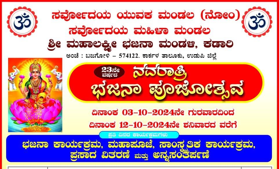 ಮುಡಾರು ಗ್ರಾಮದ ಕಡಾರಿಯ ಶ್ರೀ ಮಹಾಲಕ್ಷ್ಮೀ ಭಜನಾ ಮಂದಿರದಲ್ಲಿ ದಿನಾಂಕ 03-10-2024 ರಿಂದ 12-10-2024 ರವರೆಗೆ 23ನೇ ವರ್ಷದ ನವರಾತ್ರಿ ಭಜನಾ ಪೂಜೋತ್ಸವ ನಡೆಯಲಿದೆ.